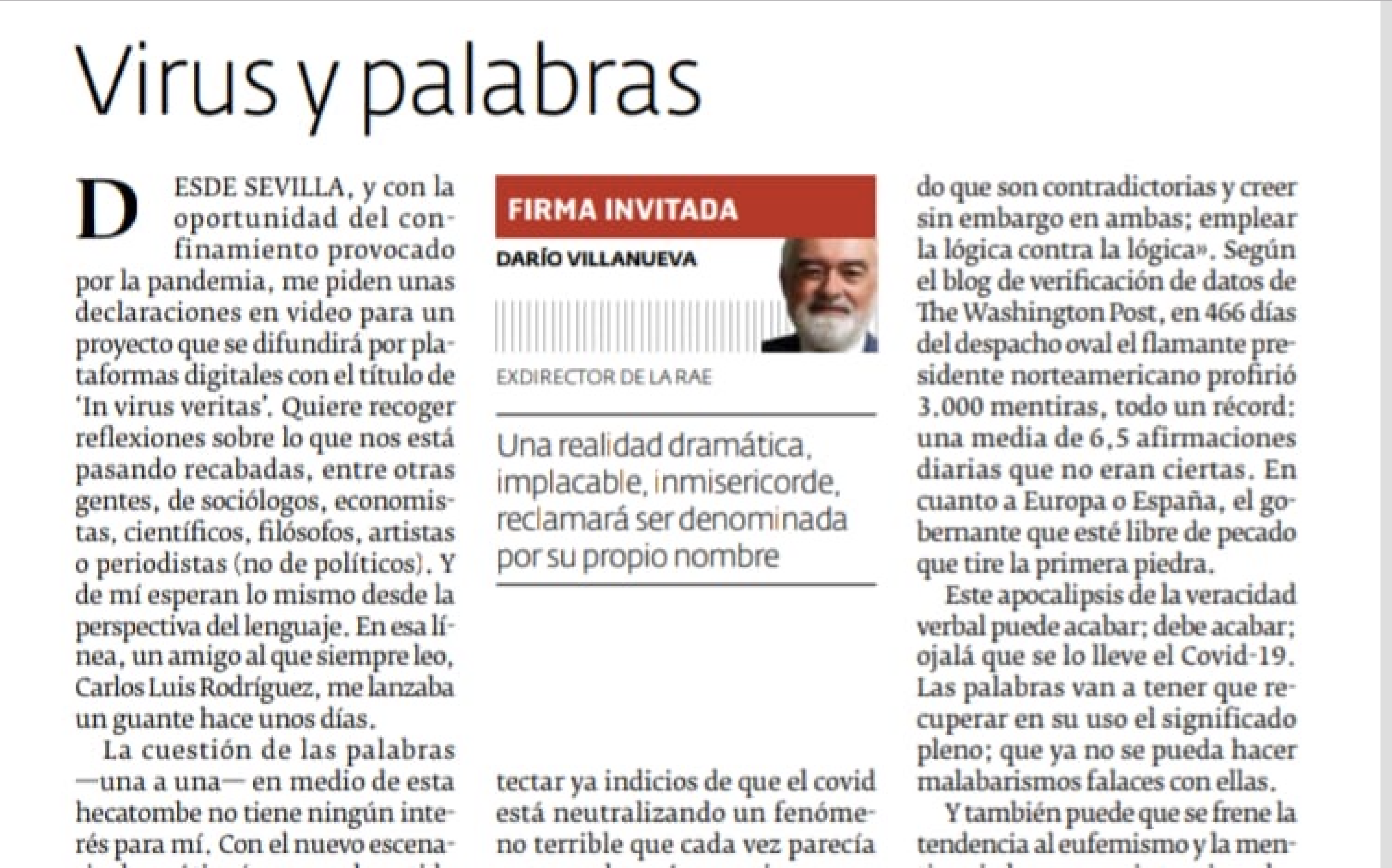 皇家學院前院長 Darío Villanueva 的〈病毒與文字〉強調回歸知識,新冠病毒書寫法是「陽性」