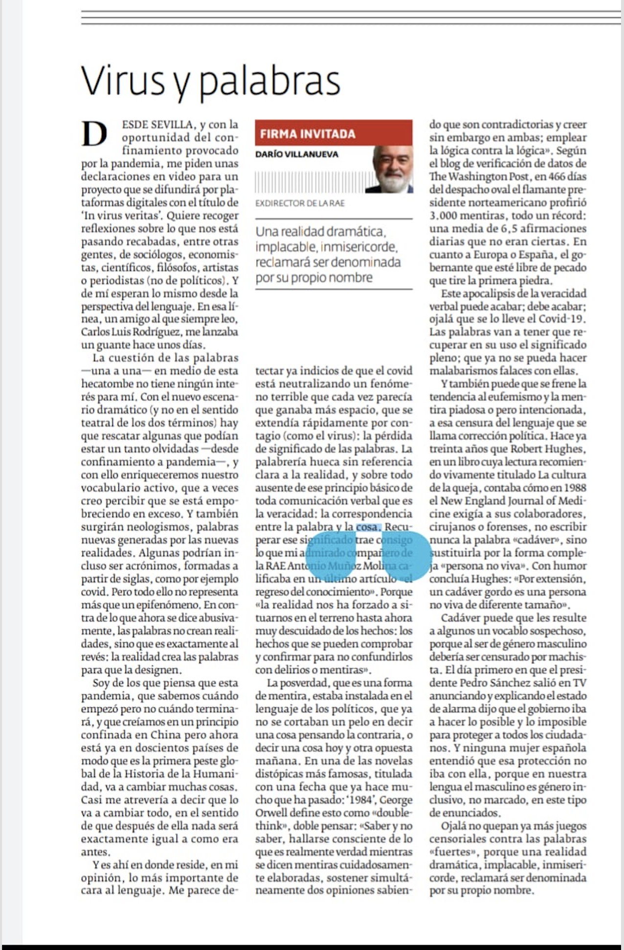 皇家學院前院長 Darío Villanueva 的〈病毒與文字〉強調回歸知識,新冠病毒書寫法是「陽性」
