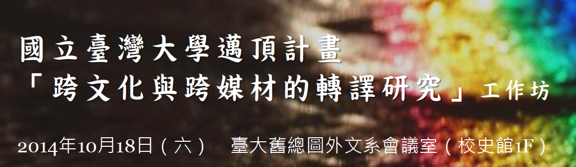 「跨文化與跨媒材的轉譯研究」整合型計畫 (III-II) Cross-cultural and Cross-media Translations 時間:2014年10月18日 (星期六) 地點:臺灣大學舊總圖外文系會議室 報名網頁:http://goo.gl/forms/J7cufxjWo1 活動網頁:http://transformaxntu.blogspot.tw/