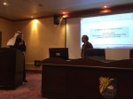 12 日的化工領域「專題研討會」(seminar)是此行主要火力點,每位老師摩拳擦掌,引介自己的研究領域和成果,主導此次專題的主力是年輕的 Bader Al-Anzi 教授,科大老師全神貫注,向來眼神向西看: MIT,卡內基,不然也是母國大不列顛,如今看到 NTU 展身手,亦讚亦嘆頻招手。國際長先發說原由,三度來訪心繫科,治平老大打頭陣,籌備院長已兩年,現場聽眾真有趣,紳士皆師長,學生盡淑女。[想起兩年前科威特大學對我們簡介他們的學生比例時,說到「全校學生女多男少,工科 75% 是女生,男生繼承家業,女生努力讀書,嫁給繼承家業的男人,當四分之一夫人 」(男人可娶四妻)]。臺大團隊輪番上場,治平老師,國倫老師、嘉文老師、宗昕老師、秉鈞老師,每人 20 分鐘完全打擊,好個精彩的上午場。