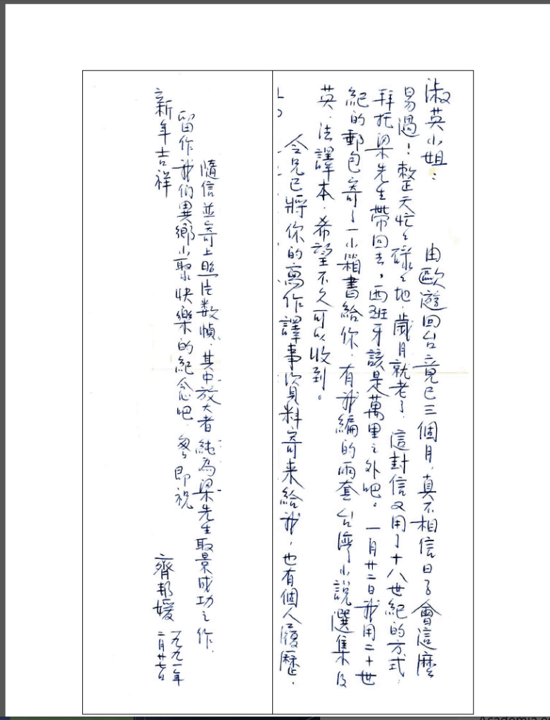 齊教授西班牙三日行,短暫的三天聚合談話,我們好像規劃了千秋大事。在梁家,我聽,我看,之後,我需要力行,但是這條力行的路,漫迢迢。齊教授是認真的!她在 1991 年 1 月 22 日寄給我兩套她主編的台灣小說選集和英、法譯本。2 月 27 日又託返台探親的梁君午教授帶回她親筆的書信給我。看到信又收到書後,再一次,我又忐忑了。齊教授是認真的,是嚴謹的,比我還當真!我看著厚實精美的《中國現代文學大系》,一陣喜悅,一陣壓力。但知道一時還做不到中西翻譯出版,總是可以當相思藥,閱讀解鄉愁。齊教授無非希望我多閱讀,多了解,有朝一日要翻譯成西班牙文出版時,可有相關作品參酌,更精準地掌握台灣文學現況。這兩套書,隨著我完成博士學位,又回到台灣。