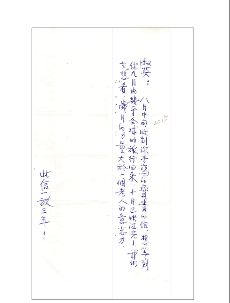 8 月11 日晚上我有活動餐會,回到家都晚上 11 點了。齊教授的書也翩然來到,裡面還夾了一封信和 1990 年我們在馬德里的幾張街景合照。這封「寫一半的信」齊教授曾託人轉達告訴我:「齊教授說,她給妳的回信寫一半了,只是還有另一半還沒寫完」。結果隨著新版的《一生中的一天》夾帶的信件,就是齊教授說的那寫了一半的信。她說已經放了三年了,一定要寄給我,原來三年前我也是用紙筆手寫書信郵寄給她。齊教授書信的工夫和執著,數十年如一日。那工整的字跡,均勻分布筆直的排列書寫,每個字都汨出情感。她從少女時代就這樣書寫到現在,那是心的悸動,血脈的熱度,手指運筆的力道,化做文字翩翩/篇篇的美。齊教授這「寫一半的信」對我當下的工作和期許甚多,那感動,我也只有放心中了。