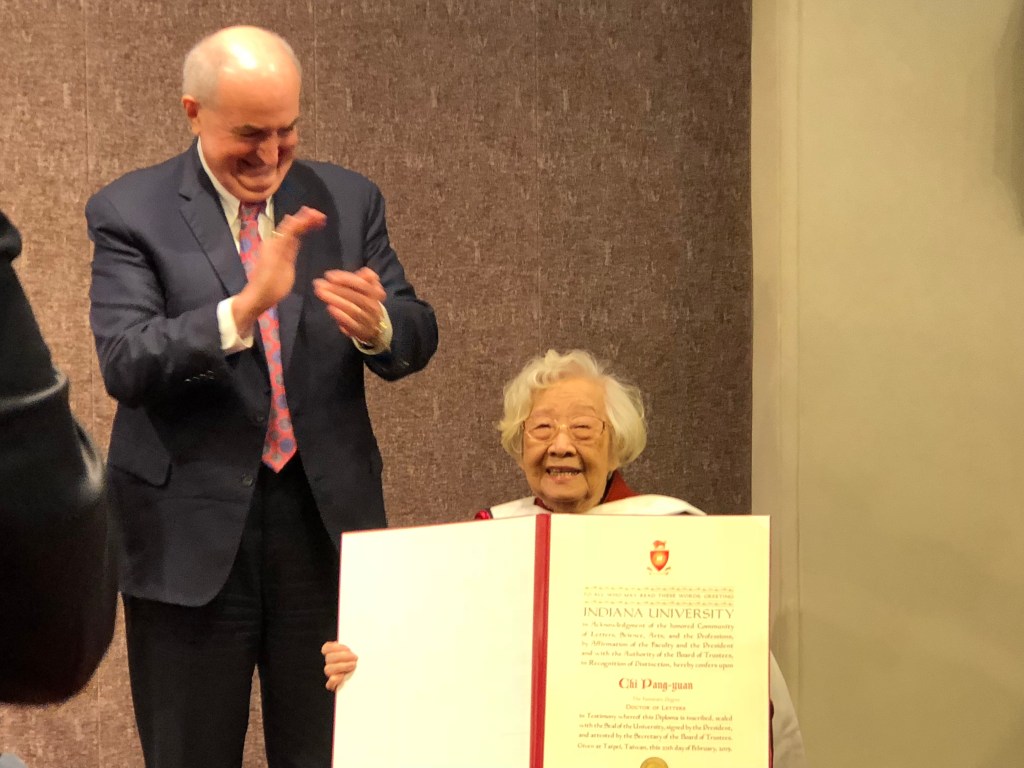 齊教授的話語令人感動,她站立致詞,英語侃侃而談,力道依然。她向孟世安 ( Michael McRobbie) 校長致謝,欣喜他閱讀了英譯版的《巨流河》,知道了她心中的學術夢想與遺憾。她提到當年選擇印第安那大學,喜愛它比較文學領域豐厚的學術能量。她致詞那幾分鐘當兒,我猜想,她的思緒是否拉回到一九六八年印第安納大學的冬日,那個殷殷期盼,想要繼續深造求學的已婚婦女,卻被父親的家書召回,要她回來協助工作繁重的丈夫和承擔家庭責任?