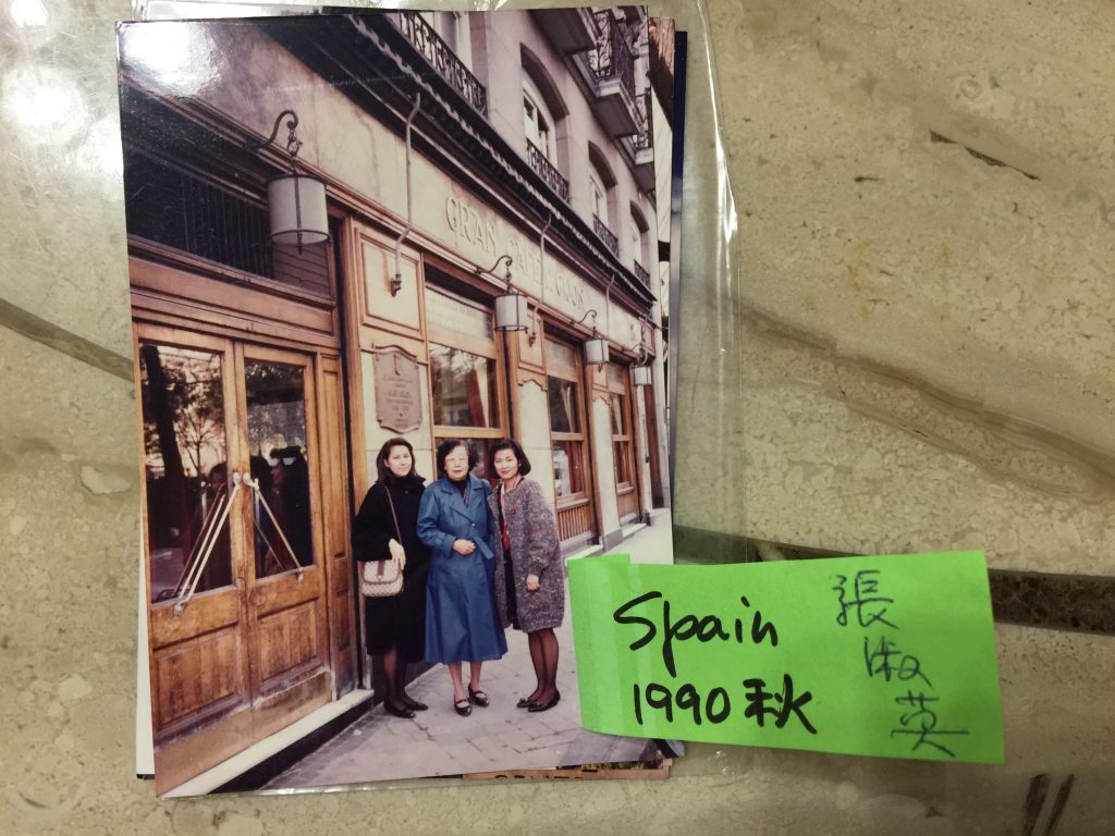 齊教授的西班牙行,來去匆匆。最後一天,梁君午夫婦和我陪她逛市區,她下榻哥倫布飯店(Hotel Colón),因此,我們想到帶她去哥倫布廣場,順道造訪旁邊的國家圖書館;走過馬德里商業文化區最美麗繁榮的幽靜大道(萊可萊托大道 Recoleto)和卡斯提亞那大道(Paseo de la Castellana)。走過了書香藝術薈萃,文人讀書會聚集的百年老店「希鴻咖啡館」(Café Gijón; 1888)和新藝術風格(Art-nouveau)的「鏡子咖啡館」(Café Espejo; 1978),也附庸風雅,模仿文人雅士喝了一杯咖啡,拍下幾張照片。那個時候,用相機,用膠捲,還要沖洗相片。這短暫相聚,齊教授用她的相機拍下幾張照片,在我這兒,也在她那兒。在我這兒的照片是齊教授回台沖洗後寄給我的。她跟我,兩人都保存了近 30 年。2017 年她贈送我新版的《一生中的一天》(散文·日記合輯)時,把這組照片再寄給我。我沒問她原因。也許,她希望我保留,保留這份「特殊的感情」; 也許,她以為我沒有(或遺失了),寄給我留念。我比對了一下,我倆保存的一模一樣:一樣多張,一樣的景點。