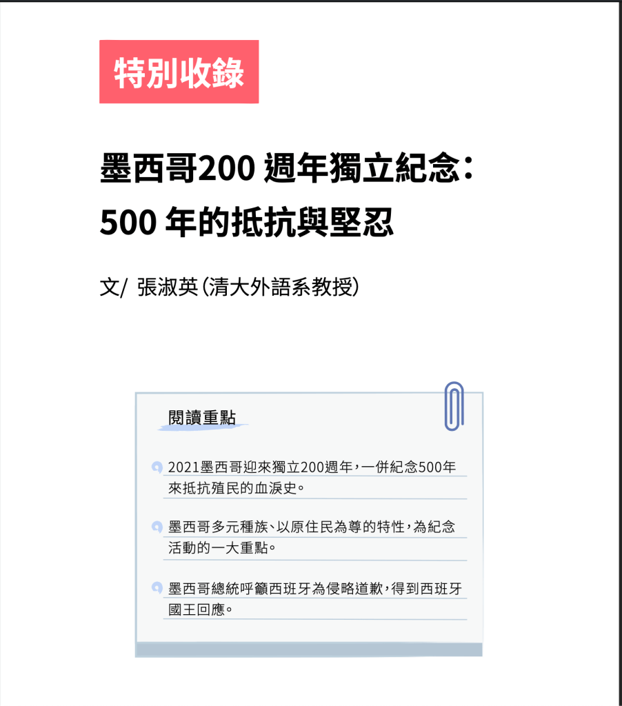 〈墨西哥200 週年獨立紀念:500 年的抵抗與堅忍〉,《英語島》,2021 年 9 月。