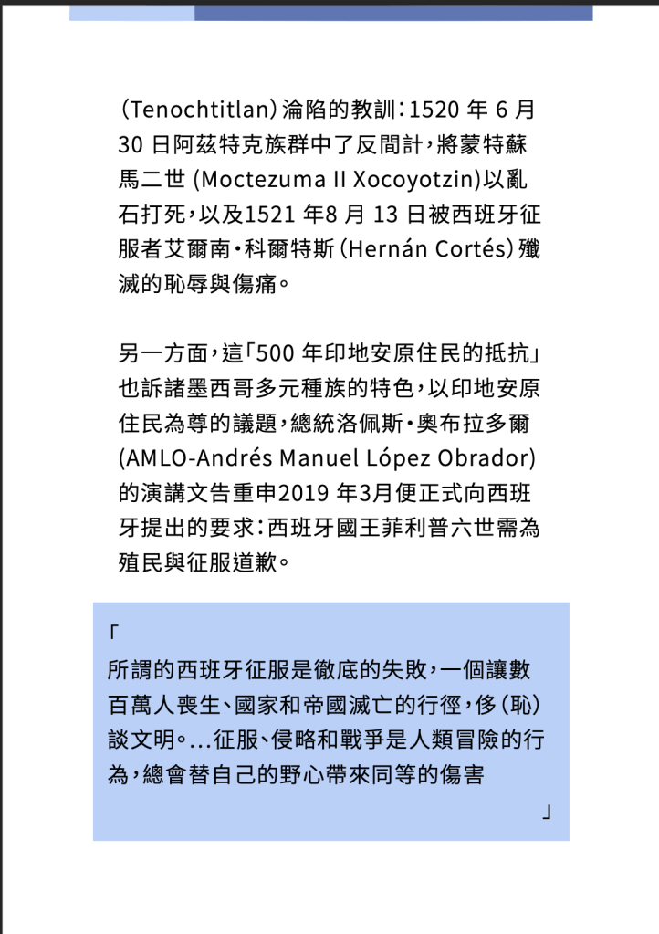 另一方面,這「500 年印地安原住民的抵抗」也訴諸墨西哥多元種族的特色,以印地安原住民為尊的議題,總統洛佩斯・奧布拉多爾 (AMLO-Andrés Manuel López Obrador) 的演講文告重申 2019 年 3 月便正式向西班牙提出的要求:西班牙國王菲利普六世需為殖民與征服道歉。「所謂的西班牙征服是徹底的失敗,一個讓數百萬人喪生、國家和帝國滅亡的行徑,侈(恥)談文明。… 征服、侵略和戰爭是人類冒險的行為,總會替自己的野心帶來同等的傷害」。