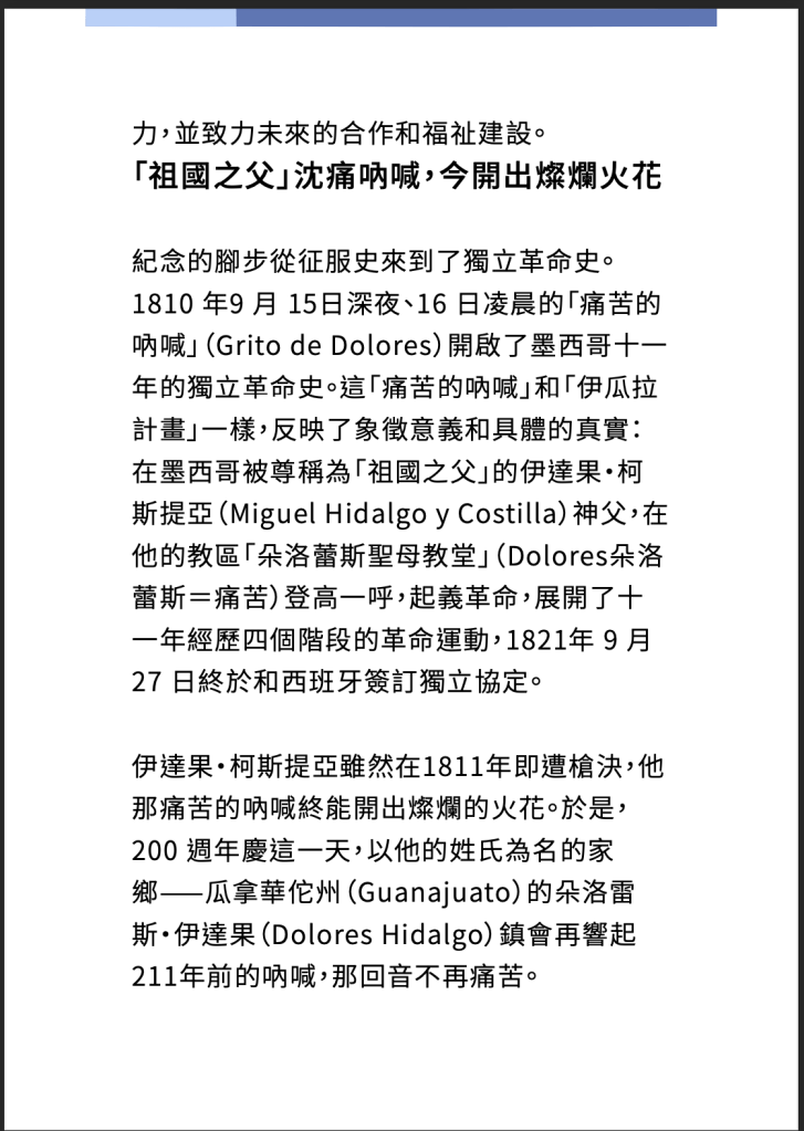 墨西哥的獨立紀念,不惟要紀念獨立戰爭,不僅欣慰已獨立兩百年,而是要追溯到殖民時期以為惕勵,除了控訴西班牙殖民的暴力、剝削和役奴,還要以五百年的抵抗與堅忍醍醐灌頂。因此,今年的兩百週年,更細說從頭墨西哥的前世今生,每一個讓今天的墨西哥重生的日子,都成為墨西哥學院(El Colegio de México)教授布雷納(Roberto Breña)筆下所謂的「成就與鞭策」。