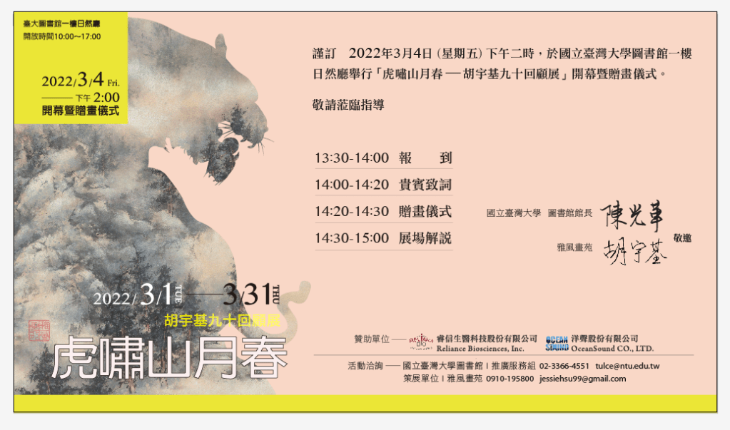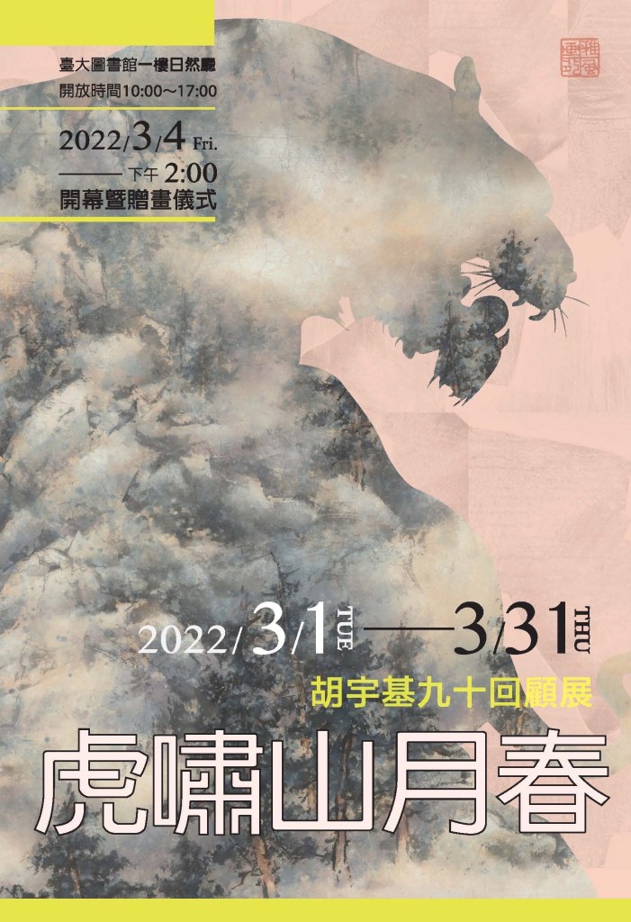 九五耆宿(1927-),畫家胡宇基先生,2022 年 3 月 1-31 日將於臺灣大學圖書館總圖一樓日然廳舉辦「虎嘯山月春」九十回顧展,並於 3 月 4 日舉行開幕典禮。