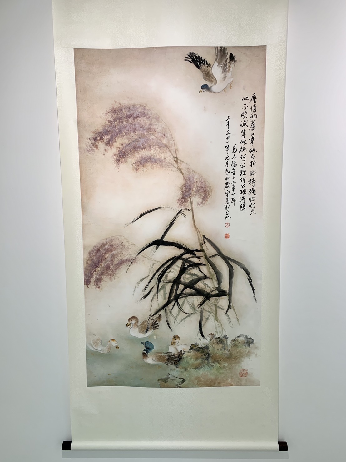 胡宇基先生的禽鳥集:不論是各類的鳥、鴨、雞、鵝、牛、兔、虎,總是成雙成對,鶼鰈情深; 或是成群覓食,成群逸樂,一種和諧祥和的氛圍; 水墨的黑白當中,凸顯了嶺南畫風的豔麗色彩,更顯質飽滿、氣滂礡; 花香集中,即使枯萎的荷花,都讓人愛憐不忍棄,斷了梗彎了柄的荷葉都還想奮力一挺,他的愛荷(愛河)不只是美好的荷(河),更是堅貞永誌不渝的鍾愛,無怪乎去年預定的畫展中他用「宇荷芳霏」為題,原來取自他和愛妻的名字,細訴他曾寫過的「… my Beloved / Whose faithful love has inspired me / To capture these images of / God’s never-ending love for creation」。
