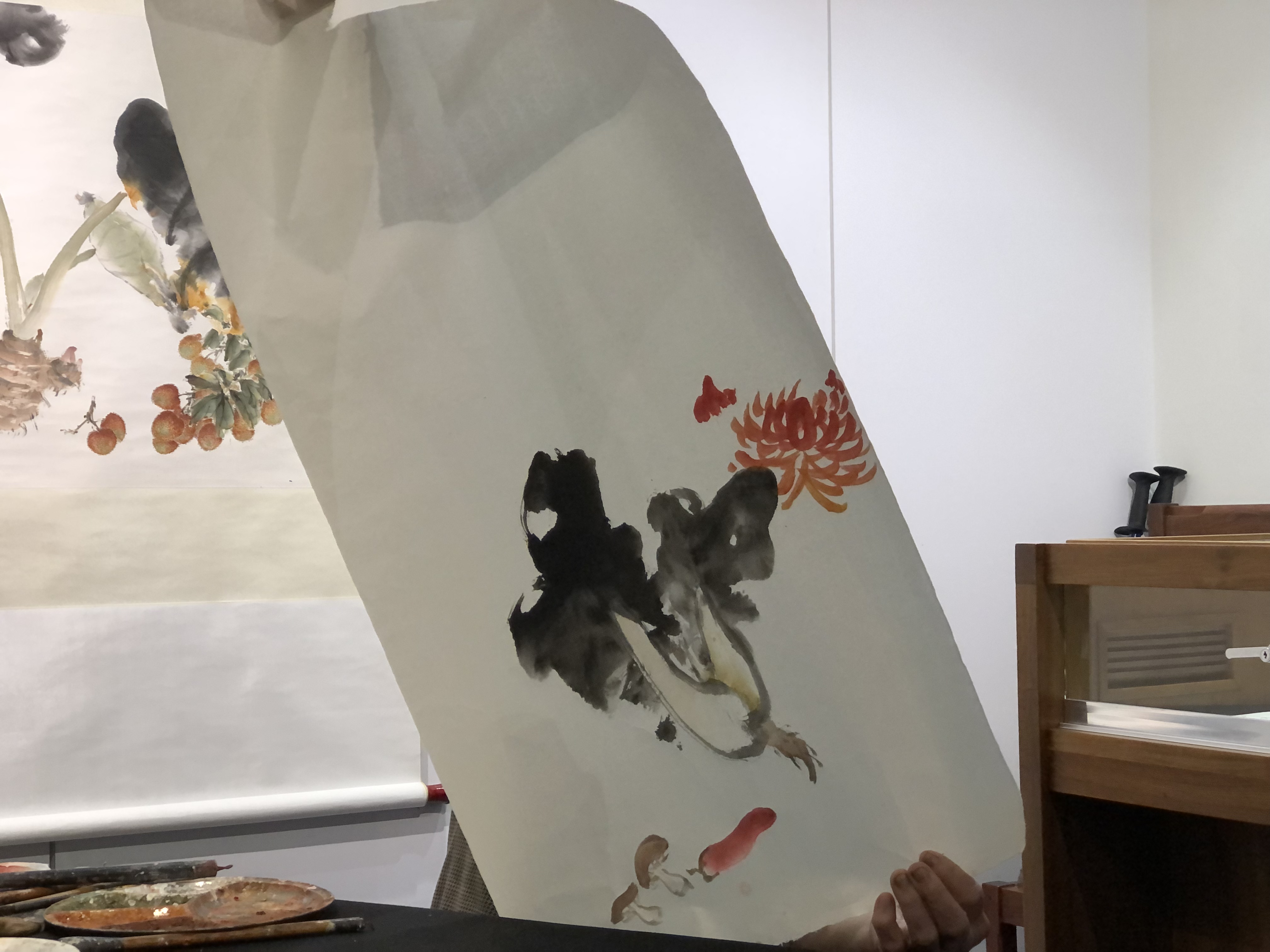 緊接著,他拿起棉紙(也可能是宣紙,外行的我目視卻沒仔細詢問呢!),兩面審視,細看是光滑面還是粗糙面,翻了兩番,才將紙攤平。我意識到他花在調色、蘸水、沾紙吸水的時間似乎遠比下筆繪畫的時間長,不時見他拿著筆左右上下點水、磨墨,一會兒說「顏色太深喔」,一會兒又說「太濕喔」,又一會兒說「顏色不夠」… ,「這筆不好喲」,「這什麼喲?高高低低的… 」(桌子不平緣故),「要小心喲,不能太濃,也不能太淡」,又提到羊毫和狼豪的差別,影響畫質與效果,說著說著便翻到畫紙背面,看看滲透的情形,每個步驟彷彿步步為營般… 只見他手執筆不曾停過,甚至直接把筆倒過來,用筆頭沾點色彩,在大毛筆腰上圍(毛筆的胸膛部位)橫添一抹墨色,怎知這一下筆,只見黑墨一大撇一大撇濡染,兩旁線條分明,一個影像赫然出現,我們從這頭兒看過去只是一抹一抹的黑,中間兒帶點乳白,畫家將畫轉過來向著觀眾,大家一看,驚之嘆之:「哇!白菜耶」。那當兒,我心裡其實有另一個影像,直覺太妙了。我看到的是「奶油白菜」!我認為,大家印象中的(大)白菜,它的白色肌理平直而有纖維,黃綠色的葉片部分包的比較緊實,或者,直觀認為形似故宮的「翠玉白菜」,但是畫布上的綠葉部分有點像外葉(比青江菜茂密繁華),像「燙頭髮」的大捲皺摺,而且白色的部分,每葉的寬度不若白菜寬闊,較飽實,有肥嫩多汁感,葉片部分黑的層次就像奶油白菜深綠的葉子。以前沒有奶油白菜這個品種,或許年輕學子不清楚蔬菜的種類品名變化,在我這個煮婦眼裡,奶油白菜更貼近,實為首選。旁邊兩顆香菇逗趣,一支紅辣椒,可愛至極 (只不過是兩撇,不是嗎?唉!這藝術的「形而上」簡直變成哲學的「形而上」的沈思了!)。畫家這幅蔬菜畫教導大家如何使用顏色與色差,而不是「原色」的「塗畫」或「徒畫」。