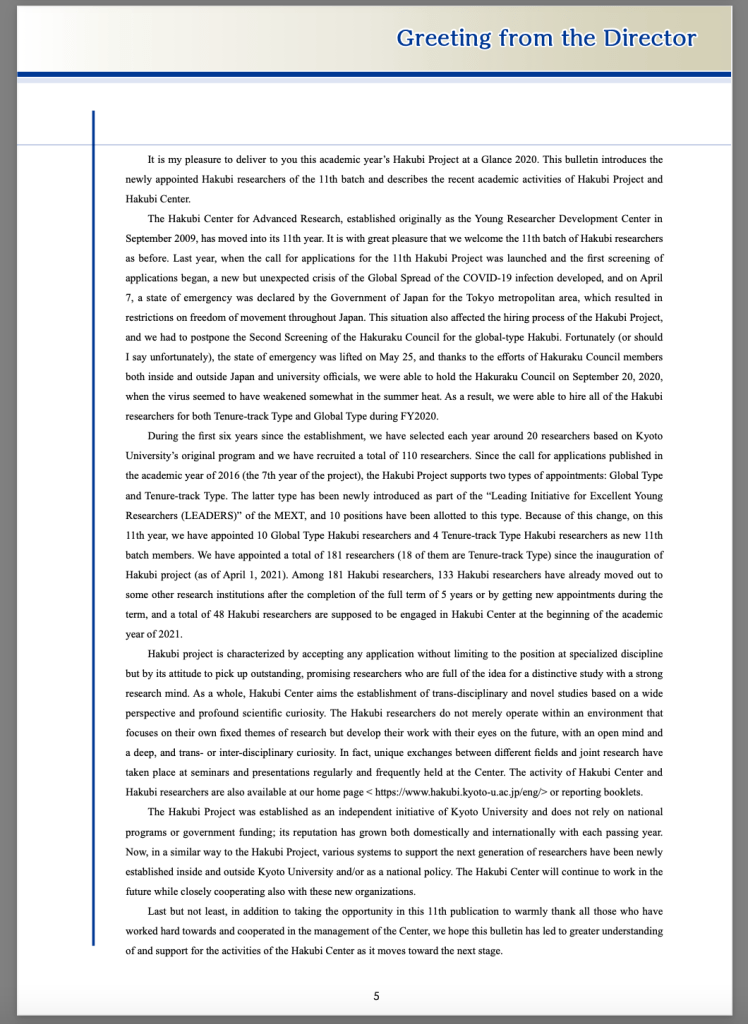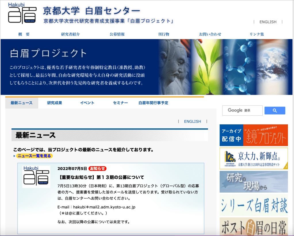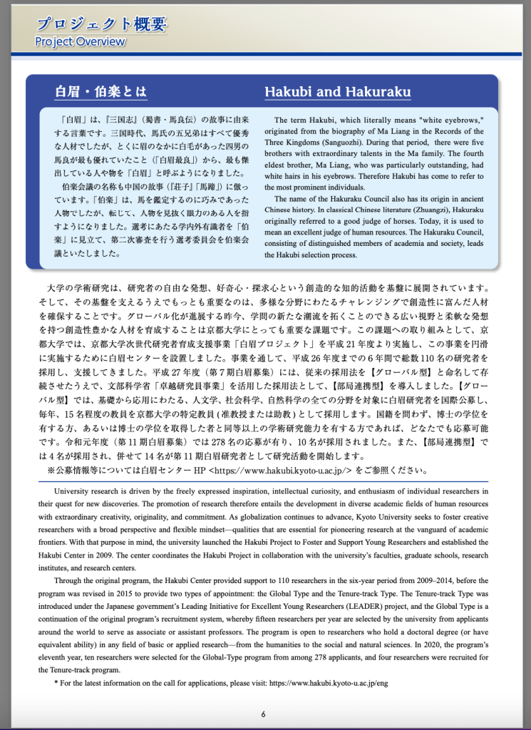 這個計畫,就是京都大學的「白眉計畫」(The Hakubi Project)。聽到、看到這個詞兒,先是勾起大家的好奇心,再來是一陣驚艷,不由得讓人讚之嘆之。「白眉計畫」成立於 2009 年,也就是松本紘擔任校長期間(2008.10.01-2014.09.30)設立,用意在拔擢傑出年輕學者(觀其意,不僅僅是優輕,而是傑出卓越了)。松本紘校長嚮往中華文化,喜書法,熱愛研讀中國古典書籍。且看白眉計畫的目的與緣由: