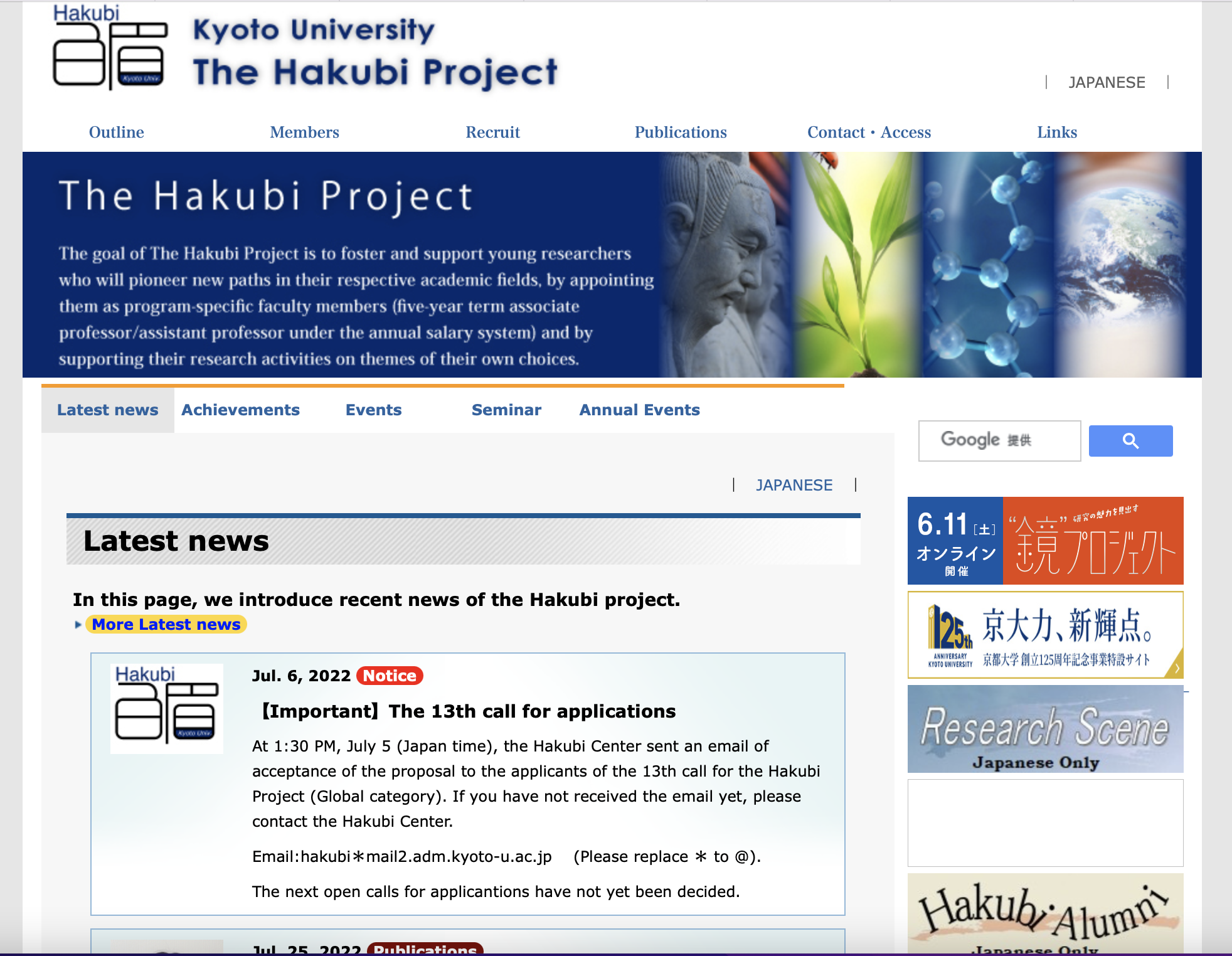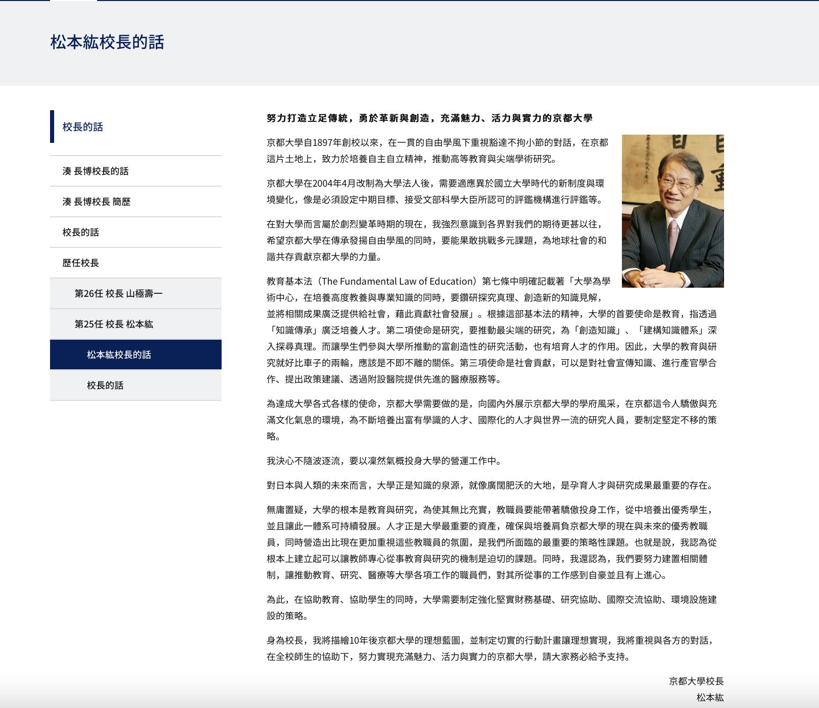 這個計畫,就是京都大學的「白眉計畫」(The Hakubi Project)。聽到、看到這個詞兒,先是勾起大家的好奇心,再來是一陣驚艷,不由得讓人讚之嘆之。「白眉計畫」成立於 2009 年,也就是松本紘擔任校長期間(2008.10.01-2014.09.30)設立,用意在拔擢傑出年輕學者(觀其意,不僅僅是優輕,而是傑出卓越了)。松本紘校長嚮往中華文化,喜書法,熱愛研讀中國古典書籍。且看白眉計畫的目的與緣由: