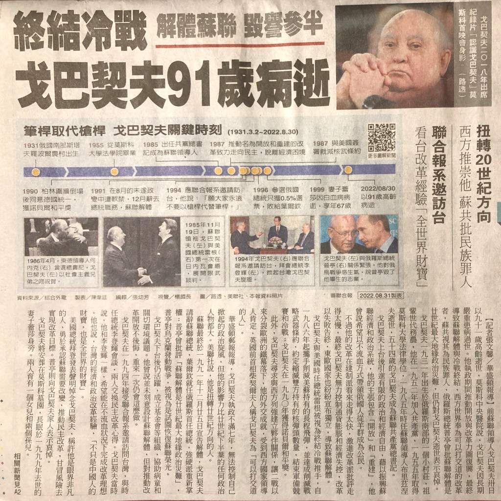 九月一日閱報,看到「戈巴契夫 91 歲病逝」的標題,頓時,記憶的匣子半掩半開,再次寫政治人物,不是因為近距離見過他,而是他的重要時代有一些印象深刻的事情,和自己的生活略有掠影擦痕。