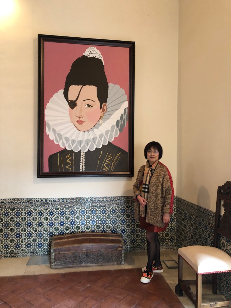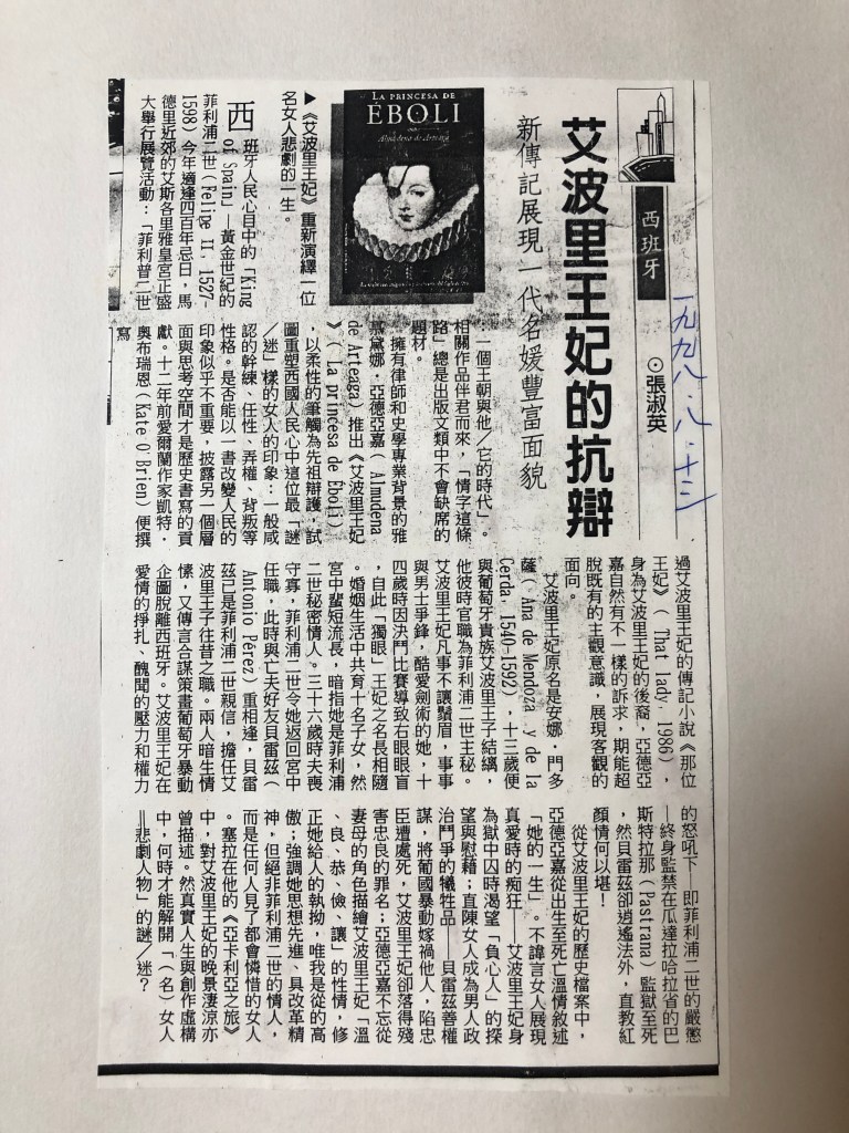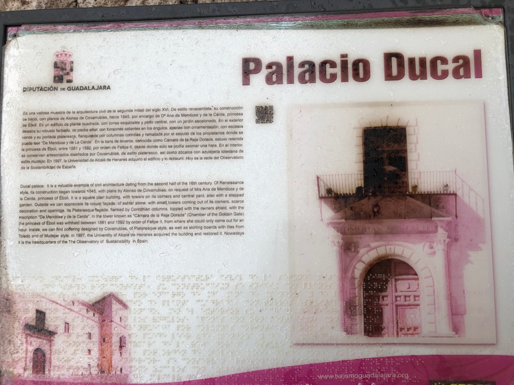 這一趟,我其實也想來看艾波里王妃。艾波里王妃是誰呢?我求學的過程中都不曾認識她呢!一直到 1996 年,翻譯《亞卡利亞之旅》時,塞拉寫到巴斯特拉那鎮,有了這段公爵王府(Palacio Ducal)的故事,始有粗淺的認識。1998 年,則因撰寫中國時報《開卷周報》(彼時已經持續撰寫四年了),每週一文的「世界書房」,讓自己閱讀量大增,而引介了艾波里王妃的後代子孫雅慕黛娜‧亞德亞嘉 (Almudena de Arteaga) 為其作傳所撰寫的《艾波里王妃》(La princesa de Éboli,1997)﹐而深深被她的ㄧ生吸引。2021 年,臺灣歐洲文化論壇特別製作歐洲王室奇聞軼事續集—「歐洲王室王妃的華麗、頹喪與永恆」,在清華大學「名人堂」舉行,我心中似有一股搔癢亂竄,於是參與主講,以「瘋女王后與獨眼王妃:西班牙黃金世紀盛世的深宮怨」為題,講了瘋女王后胡安娜 (Juana la Loca)和獨眼王妃艾波里兩位奇女子,更是戀戀難以收拾,墜入歷史的深淵無法自拔,非追根究底不可了。