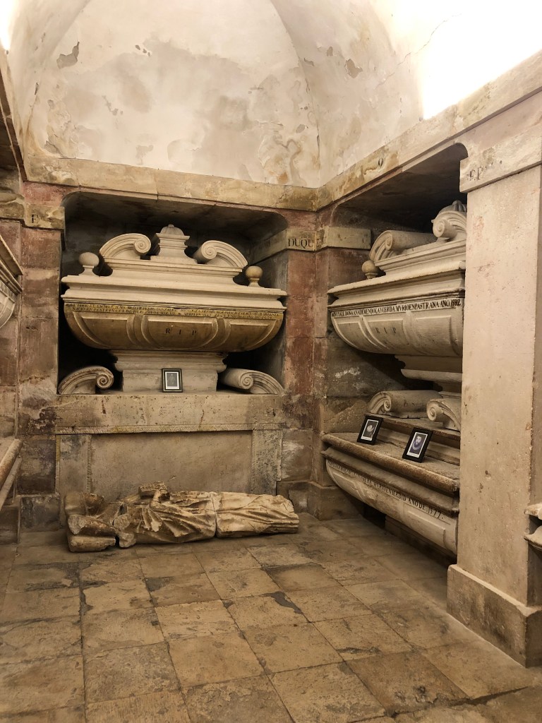 我們在那間變成監獄的寢宮徘徊,拍了照,走到窗邊模擬幾世紀前的艾波里王妃,看看「時辰廣場」(Plaza de la Hora) 走動的人群和飛鴿 (「時辰廣場」就是西班牙每個大城小鎮都會有的主廣場—Plaza Mayor,但是在巴斯特拉那稱為時辰廣場,乃因艾波里王妃最後幾年只被允許每日一小時得見天日,眺望廣場生息),著實難以繼續想像如何在這兒度過十三個寒暑且不見天日的日子。之後,走到地下室,看到艾波里王妃的陵寢和艾波里王子並置一起,家族成員也泰半齊聚,該是離世後最後的一絲絲慰藉。