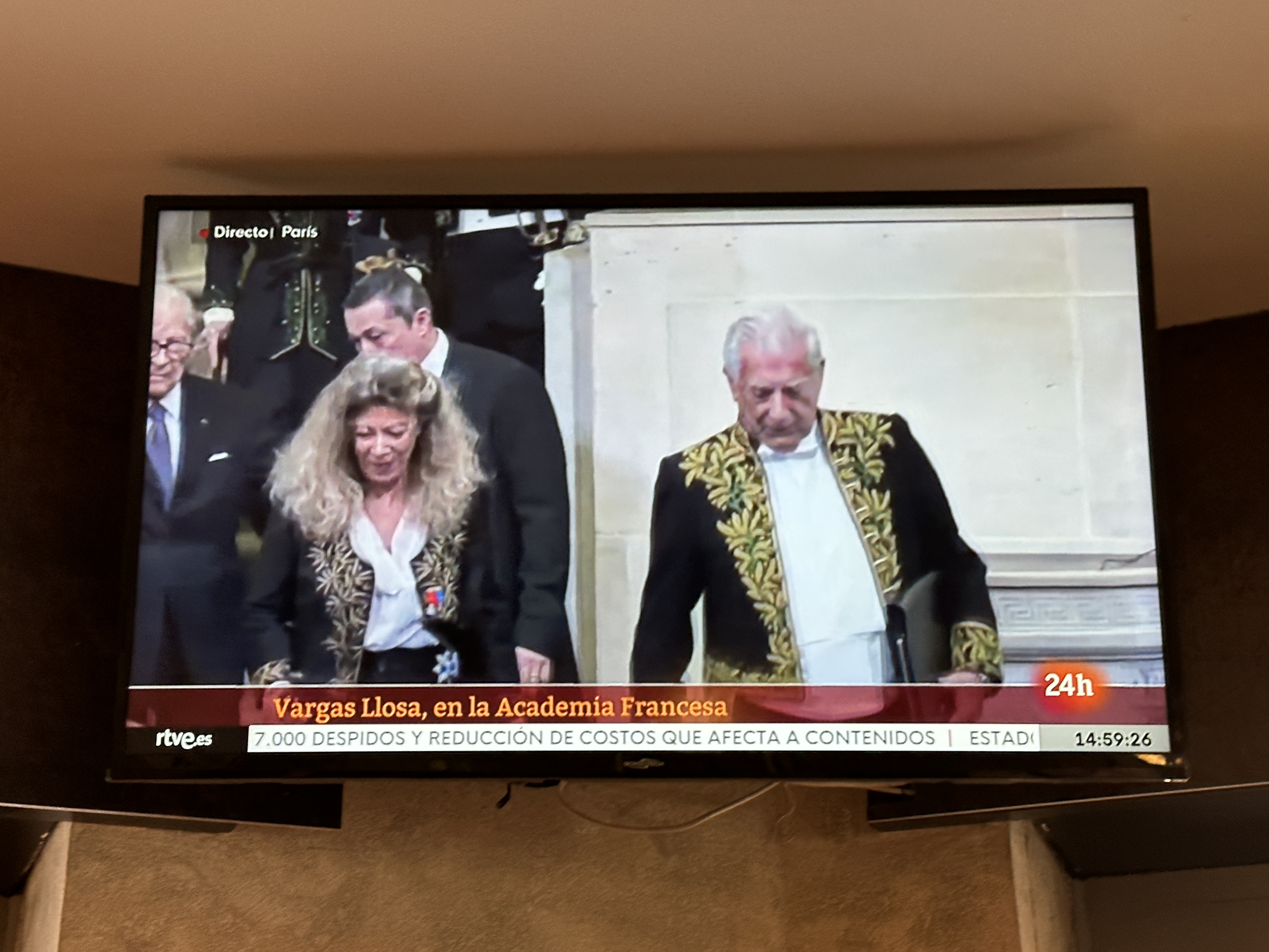 這回,尤薩身穿著名的「綠色院服」—墨綠色金線繡花燕尾服,與他結褵 50 年、分離八年的前妻帕德麗希雅 (Patricia) 與他同行,共享榮耀。成為法蘭西學術院院士這個文學情人的盛事與報導超越了現實生活上緋聞不斷的情人,尤薩用文字代替口說,許多人認為他歲末撰寫的短篇小說〈一陣一陣風〉 (“Los vientos”) 暗諷與他們同一屋簷下,伊莎貝的女兒塔瑪拉・法爾可,就是兩人分手的導火線。面對母女在媒體前總是先一步發聲的優勢,尤薩不多言語,讀〈一陣一陣風〉,已為他訴說不同世界的兩個人的風向。隔週四,尤薩回到西班牙皇家學院開全會,他對來自台灣的我已十分熟悉,我們相互問候,學院裡只有文學與學術風,其他似已雲淡風輕。