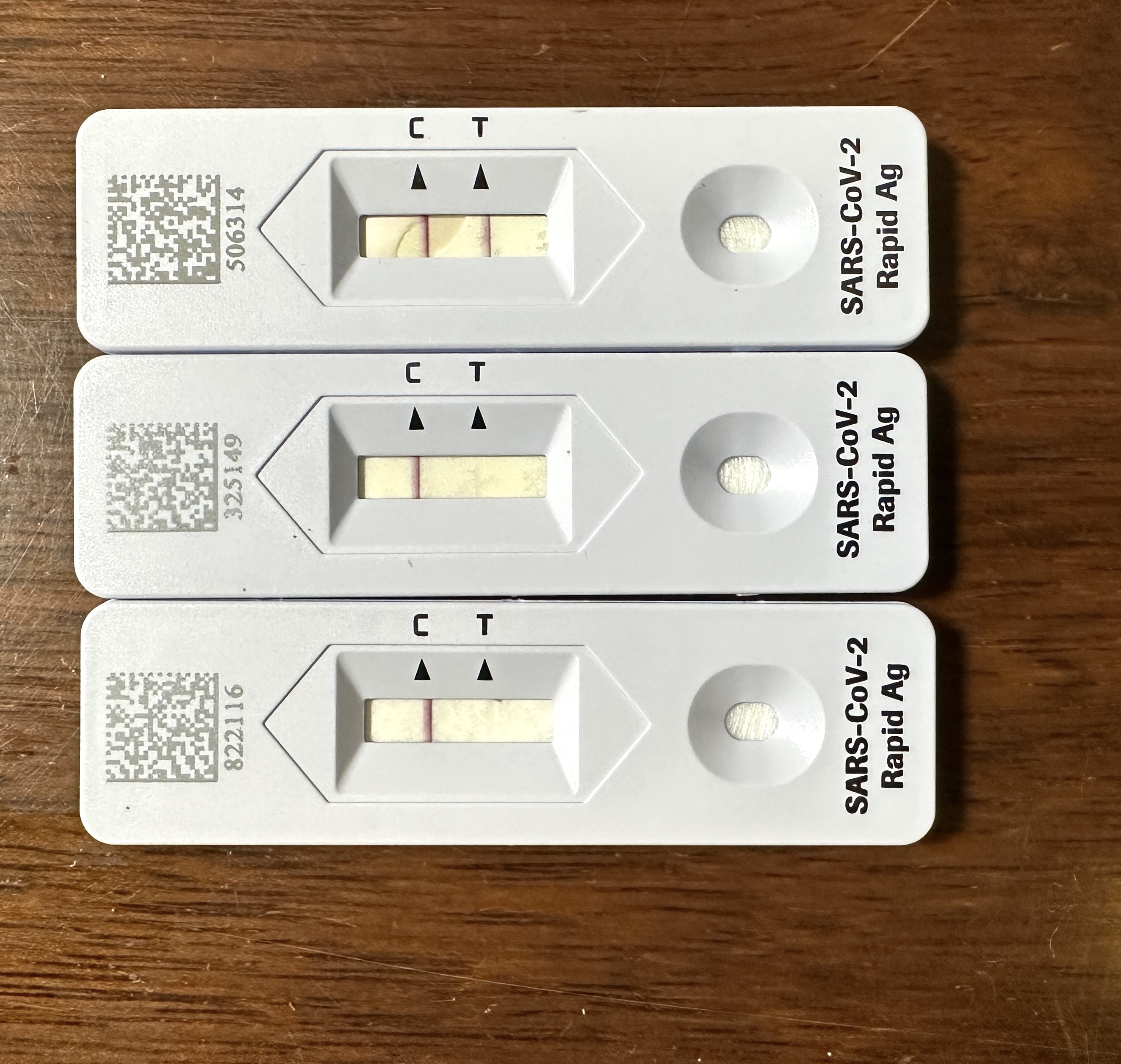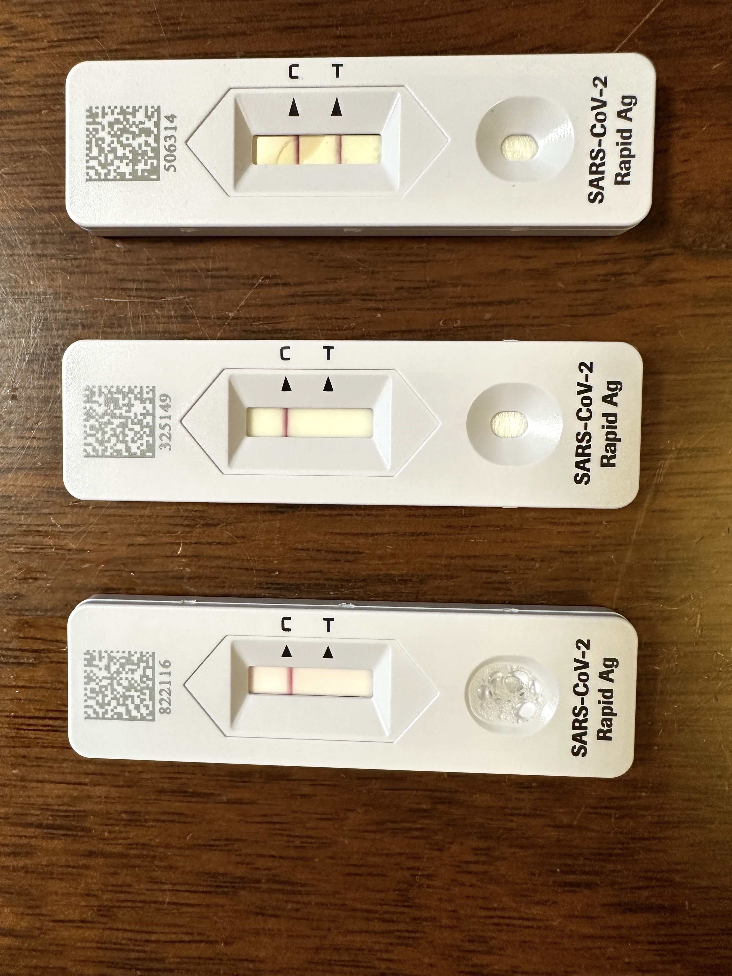 隔天,Covid 夫又做一次快篩,T 的位置「快狠準」,瞬間兩條深色紅條展現,毫無懸疑。決定在家靜養,不能將病帶到學校,金剛妻還沒事,當然要去學校,雖然是陰性狀態,但是跟學生說她必須戴著口罩上課,也不在課堂上走動,跟學生保持距離。