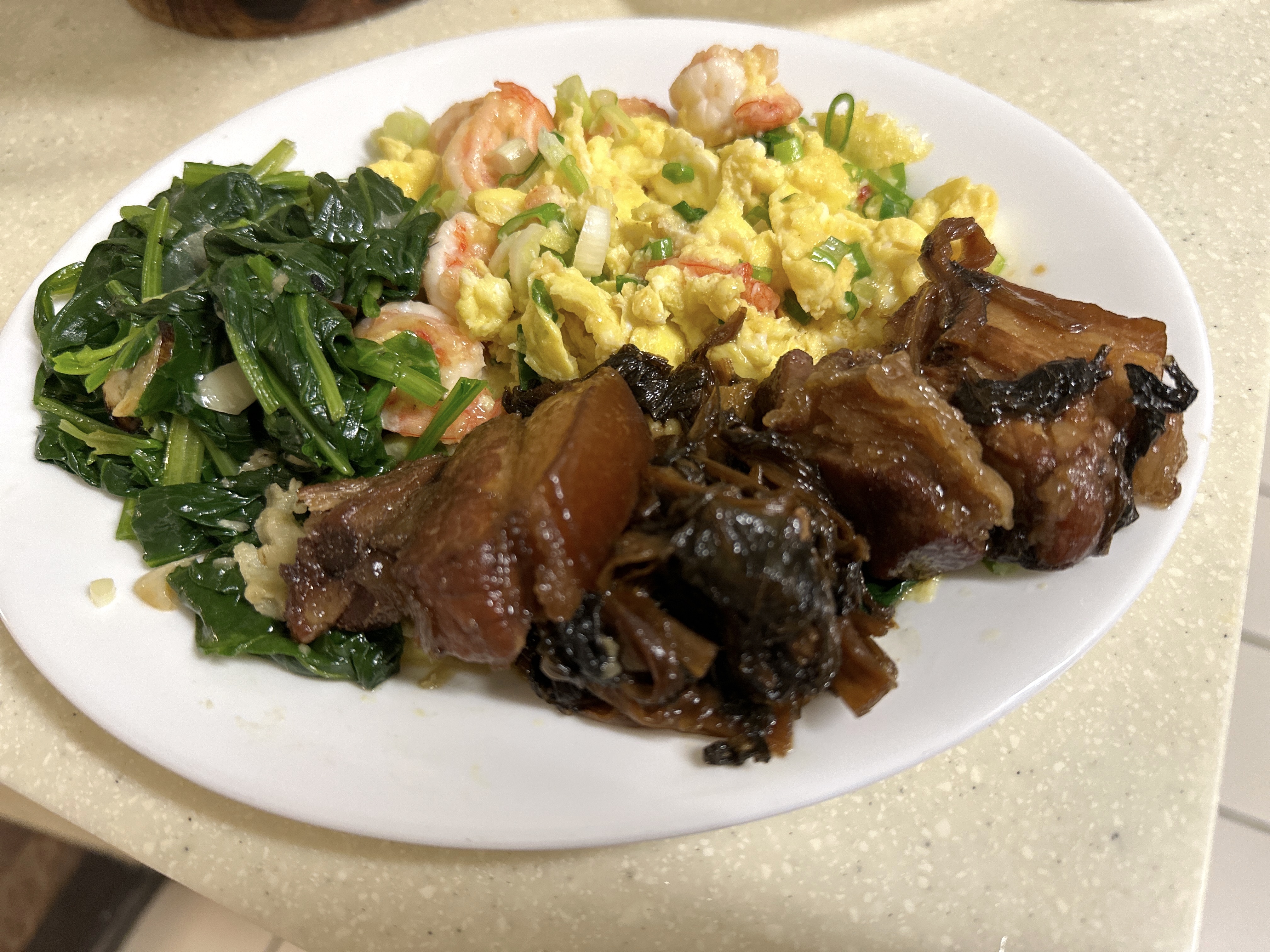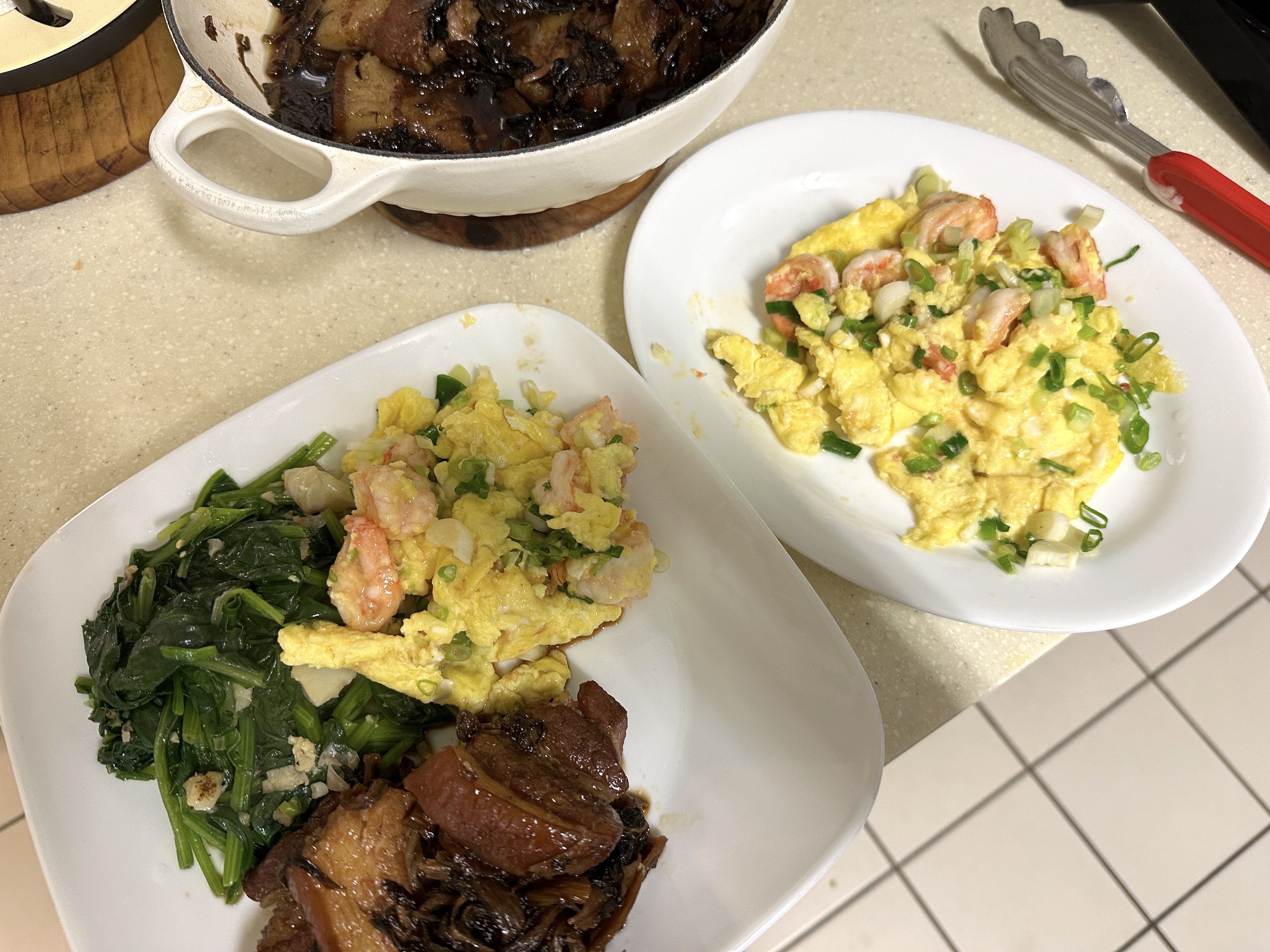 平常進廚房煮的勤快,是因為 Covid 夫還要帶便當隔天當午餐,週日金剛妻就會在午餐時偷懶:我的工作是看麵食和湯頭是否依然熱騰騰,不然我會再稍微加熱一下,也趁加熱時把黏在一起的麵在熱湯中給鬆開。接著,就是「三人行,必有午餐」。時間一到,我們比鄰而坐,還高談闊論,雖然沒有「口沫橫飛」,口氣在空中川流總是會有的,畢竟開口講話,就有聲音和氣流。