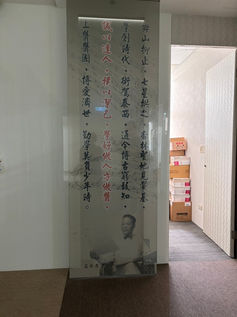 接著,我們到後棟 16 樓去看以另一位創辦人為名的胡水旺國際會議廳。會議廳對面就是美麗的幸福空間,教職員工憑證就可以刷卡,拿取機器裡面的飲料和點心、零食。我從沒使用過,藉著這一天來初嘗試。真幸運,剛好遇到公關組的組長湯湯,她教我使用。本來佑謙爸爸說不用麻煩,我請他讓佑謙感受一下幸福空間的幸福感,因為這只有教職員工才有的福利。休息一會兒,喝了飲料、礦泉水,我們再到 15 樓,看看董事會的樓層,牆壁掛著校歌的歌詞,紅色凸顯的一行「誠以達人,樸以潔己,學好做人方做醫」的歌詞: 誠樸的校訓和行醫的最高行為規範。接著我們直接下樓到八樓醫學院,(13 樓的護理學院,我就用最近大家常說的「得護理人員者得天下」的名言介紹護理師的重要性。到了八樓,佑謙爸爸才又發現早上他跟吳主任一起的地方就是八樓醫學院的「徐千田紀念廳」。