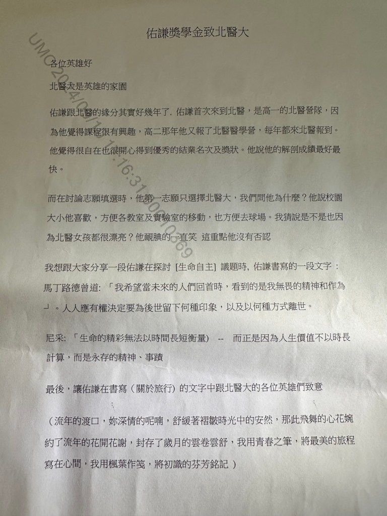 2024 年 9 月 11 日佑謙爸爸在北醫大誠樸廳致北醫大師生的話語: