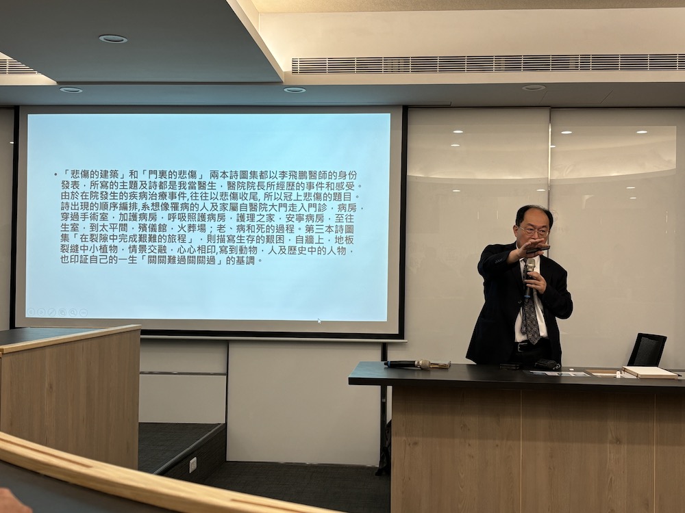 10 個半月後,2024 年 10 月 15 日,有一個名正言順的場合,我向李醫師謝謝《悲傷的建築》一書。這一天,上午也是開會遇到,如同往常……。中午是藥學院的博雅講座,由李醫師主講「由醫學跨越到詩學經驗分享」,我去聽講,發現桌上擺了許多李醫師的詩作,童詩插畫,還有英語、法語版的譯本。就在這場演講的前一週,我也收到一箱來自另一位醫師詩人的 8 部詩集,還在細細品味慢讀中。