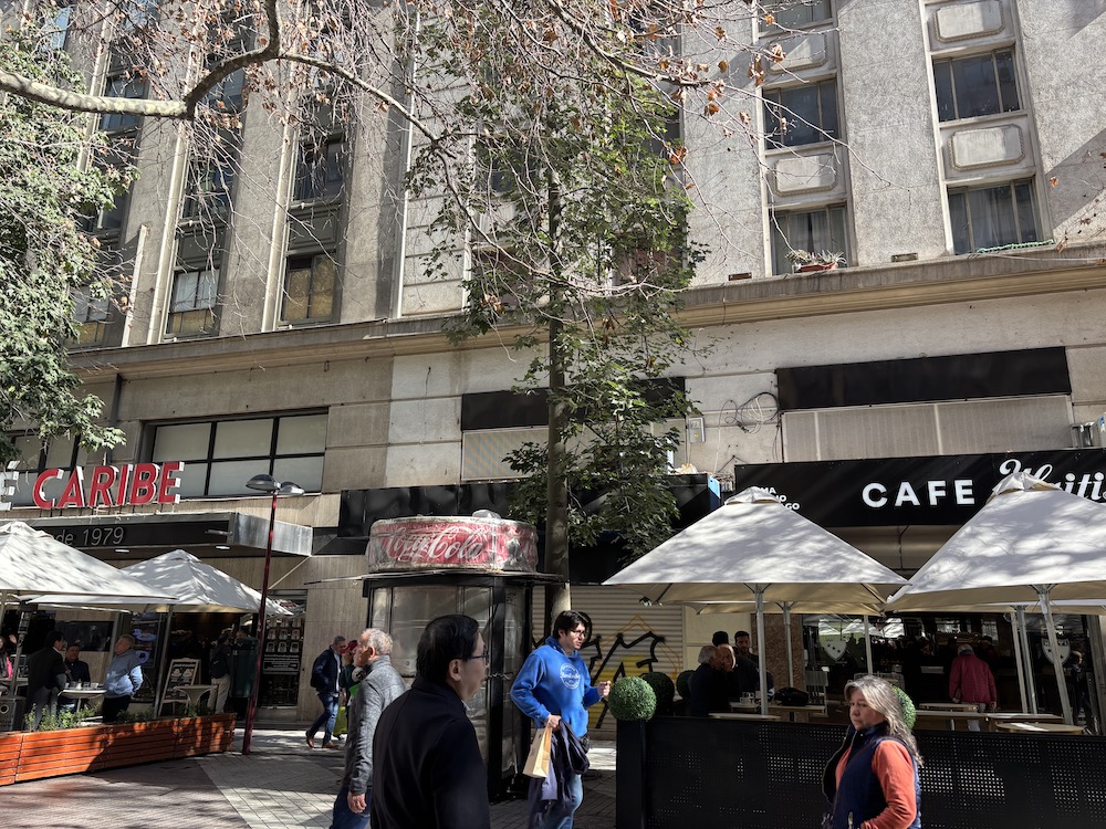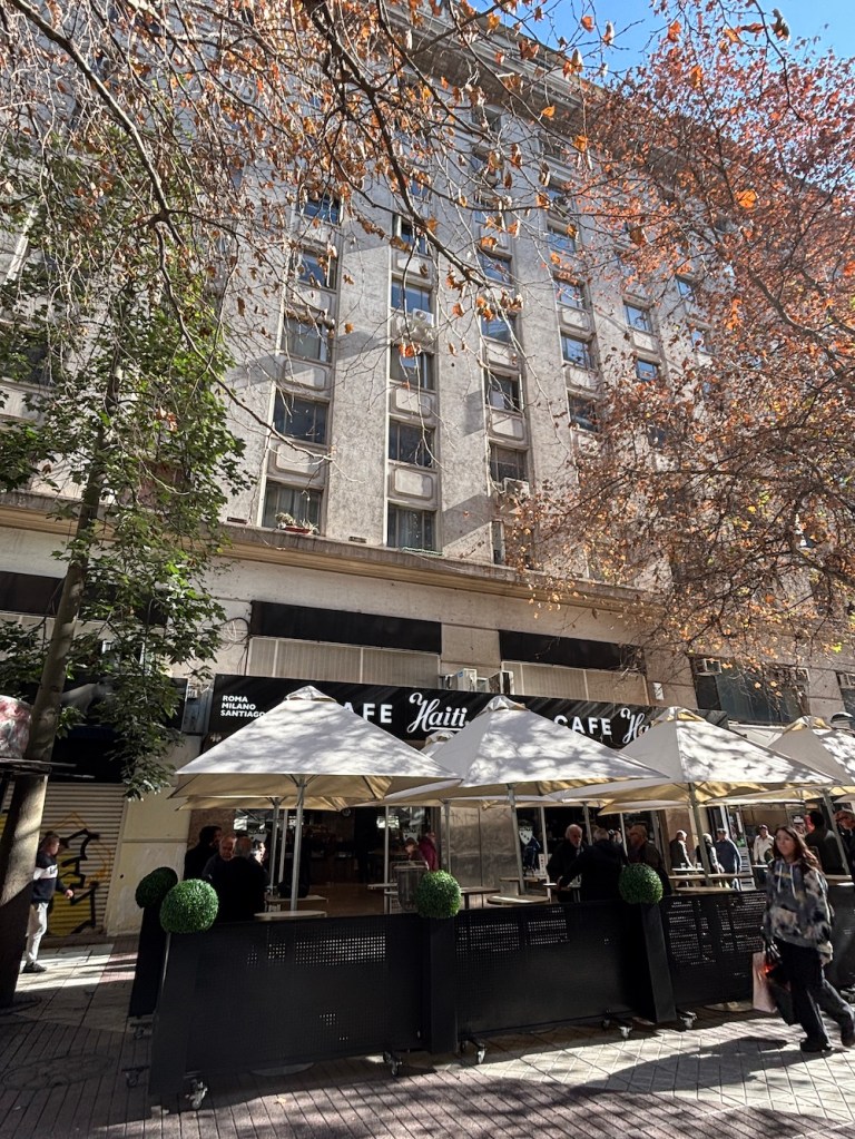 週末滿多人潮,其實走在聖地牙哥,也頗有現代感,稍不留神,一下子會忘記自己身在何處。聖地牙哥街景也有點歐洲的味道 (首都之名就是西班牙征服者 Pedro de Valdivia 取西班牙西北部加利西亞自治區首府聖地牙哥命名,也是紀念朝聖之路的「聖雅各」的名字)。阿根廷和智利是拉丁美洲最歐化的國家,過去極少有非洲黑人族群,現在移民遷徙多,也是族群大融合了)。學生指著「大腿咖啡一級區」給我們看,人潮熙來攘往,走在步道區想要拍張完整的照片也不容易,還有棚子擋住。再者,要是表現出對大腿咖啡廳過高的興致,似乎也不太符合我們的身分和品味,所以我就邊走邊抓個鏡頭,何況這排幾家咖啡廳說是一級區,也就與一般無異,只是曾經以大腿咖啡「起家」,多了點知名度吧!「拍到招牌就好吧!」(自己心裡這樣想)。結果,我拍到的這家海地咖啡廳 (Café Haití),竟然是大腿咖啡的始祖,它們集團在 1982 年起,服務生就以穿迷你裙招徠客人了。
