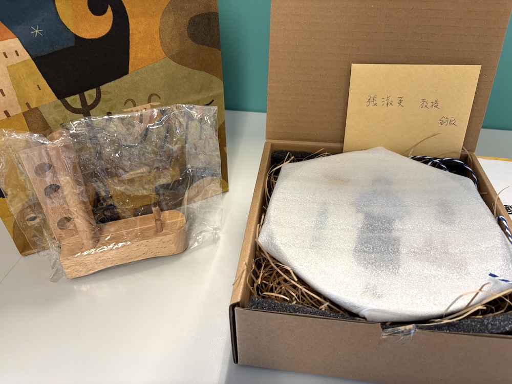 我把這份標示「易碎品」— 原來是一份「紀念品」帶到新的研究室,好好裝好它應該有的樣子,還拍了照片在 line 的家庭群組分享,不聽使喚的眼睛更模糊了,好像又得去擦拭幾下。