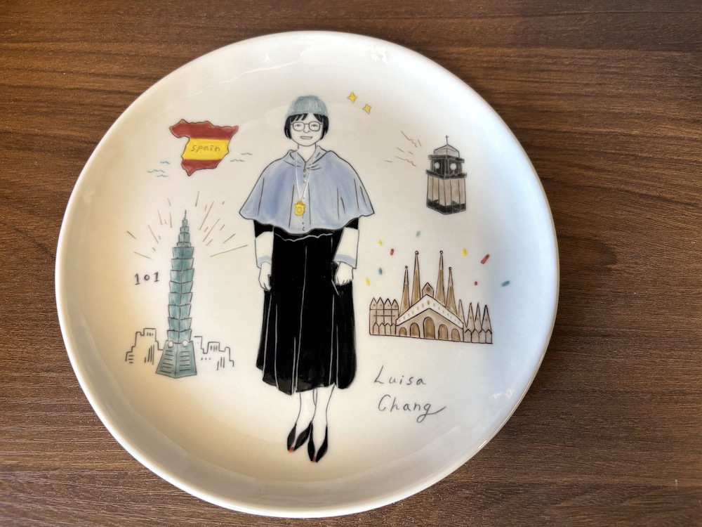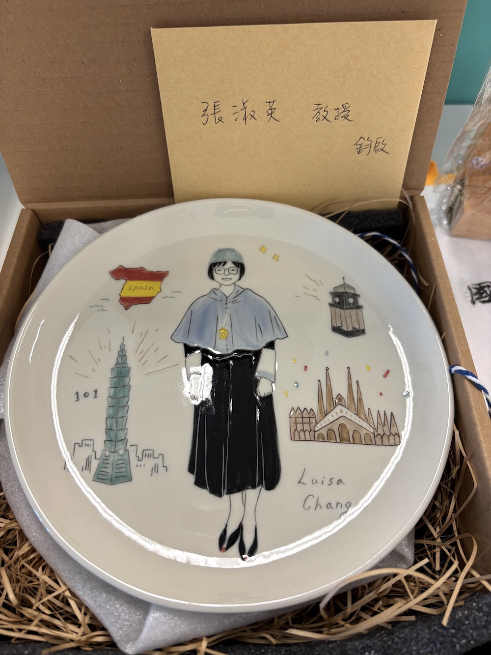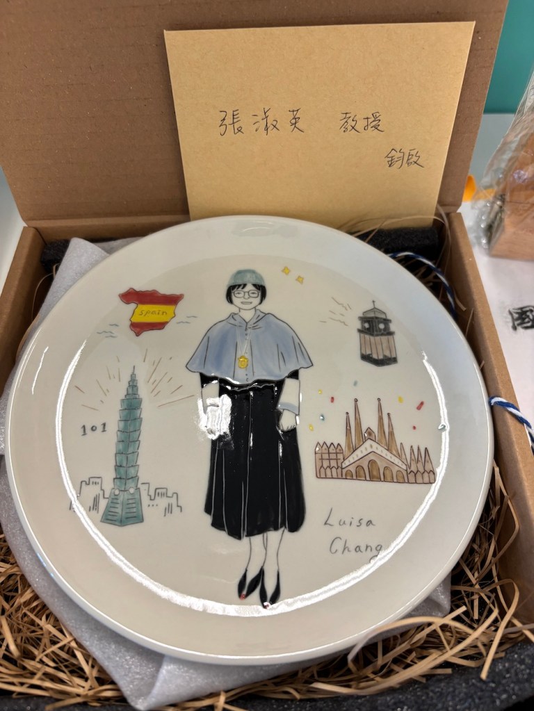 這個磁盤一定要「量身訂做的」:我在北醫大這兩年的畢業典禮,又穿上了我的西班牙博士袍(想來也只有我這麼一件,在西班牙,我也還沒聽聞有人訂做帶回家的),每次我總是穿一樣的鞋子(因為這雙高跟鞋夠高,可以挺住垂墜厚重的長袍; 鞋尖點綴小而醒目特別的粉紅,兩片鞋面間還有個透明的銜接版; 而這雙鞋子是大女兒很喜歡的款式,她要我買下來穿); 盤子的左上方是西班牙地圖和國旗顏色,下方是 101大樓,右上方是北醫大校園古典的鐘樓,下方是歐式風格(應說是西班牙的大教堂),底下還有我慣常的簽名 Luisa Chang。