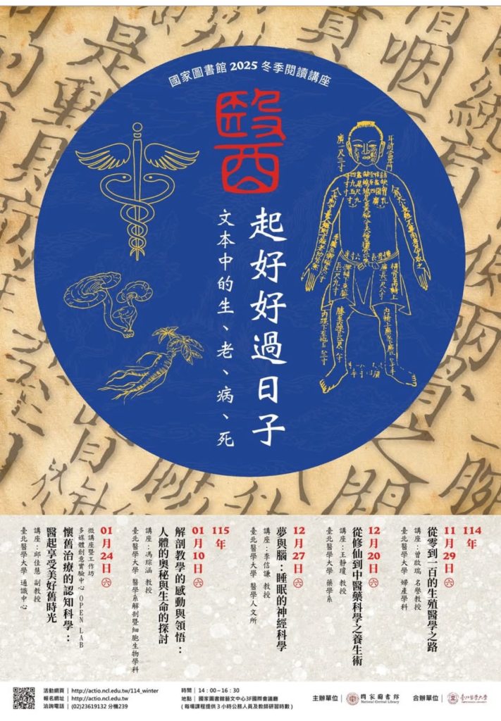 國家圖書館和臺北醫學大學今年的冬季閱讀講座「114 年冬季閱讀講座:醫起好好過日子──文本中的生.老.病.死」,共有五場演講,一直到 2026 年元月,其中馮琮涵主任的「解剖教學的感動與領悟 — 人體的奧秘與生命的探討」是解剖學課的身心啟發(2026 年 1 月 10 日 星期六 14:00-16:30)。