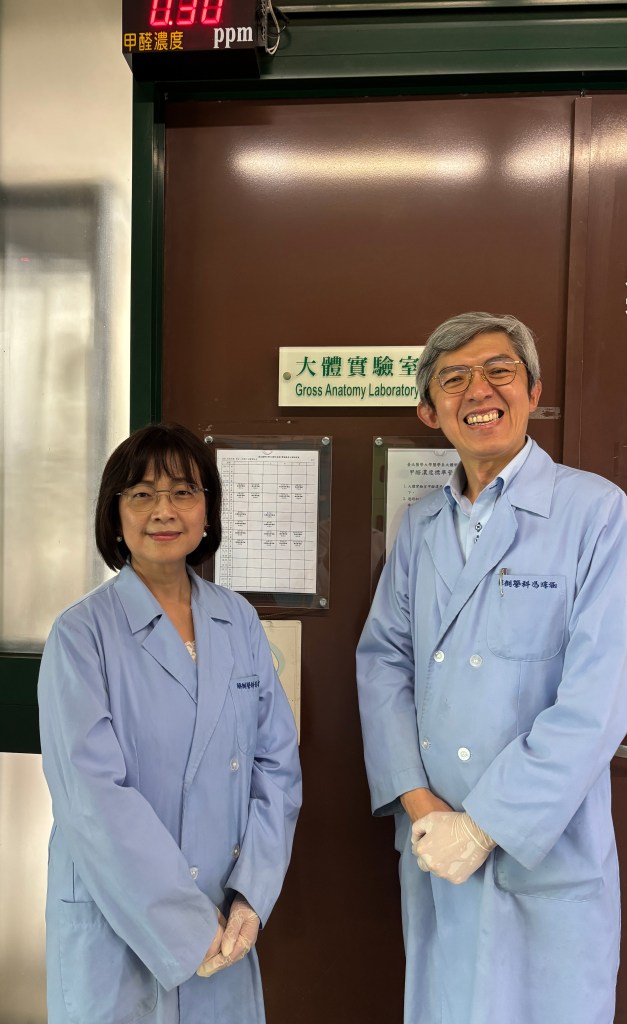 這天下午,我忽覺得忐忑,站在教室門外等候,不知是什麼心情。敬畏與敬仰之心皆有之。我看到同學開門出來,才趨前詢問 (總覺得不宜自己去驚動這門課)。馮主任依照約定時間出來接我,我才知道這門課有四位老師和醫師帶領。馮主任帶我去隔壁棟處理防腐處先行祭拜,獻上致敬禮,然後才到解剖學教室。馮主任是臺灣大學解剖學研究所博士,長期指導這門專業,他一見我,隨即給我穿上制服和遞上手套,並問我是否需要口罩。以前聽聞福馬林,說許多人禁不住那刺激的味道; 也曾聽聞說,向大體老師致敬,不宜戴口罩失禮; 而今,隨著 Covid 和許多環境的改變,都沒有了這些未經確認的禁忌。我回馮主任說不用口罩,我很能適應,也沒有覺得味道過於特殊。我在各台間觀摩,我看到每台大體相同與不同的解剖,看同學們認真仔細的操作,聆聽老師講解和詢問,他們正為著未來的醫學和專業專注努力學習,讓我也跟著上了寶貴的一課(刻)。我望著當下解剖學課的「無語良師」,想著這些大體老師的奉獻和大愛,聯想到他們的家人,讓我長達十餘分鐘,顏面神經彷彿凍結凝固了,都沒有鬆動,我來,我看,我聽,悸動與感動。