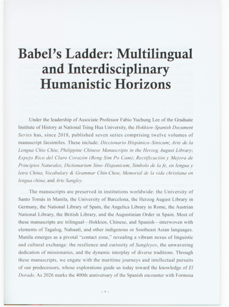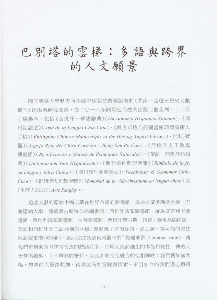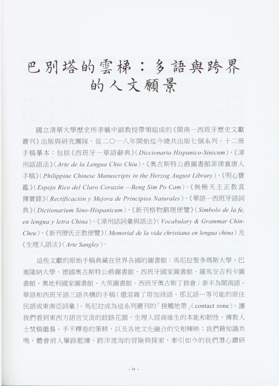 巴別塔的雲梯:多語與跨界的人文願景,《生理人語法》(Arte Sangley)序文,清華大學出版社,2025 年 12 月,p.p. v-vii; p.p. ix-xi 。