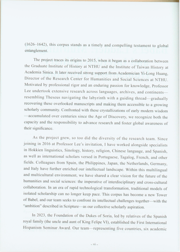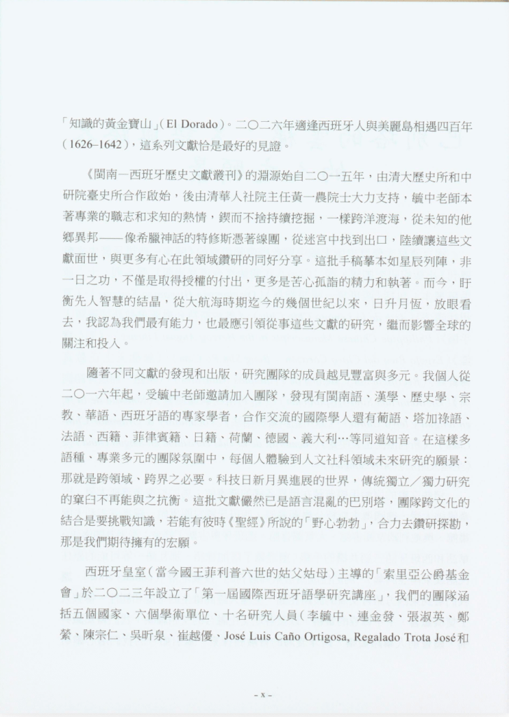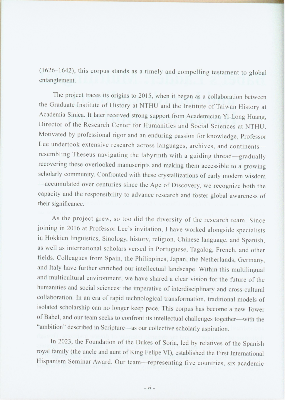 「閩南—西班牙歷史文獻叢刊」的淵源始自二O一五年,由清大歷史所和中研院臺史所合作啟始,後由清華人社院主任黃一農院士大力支持,毓中老師本著專業的職志和求知的熱情,鍥而不捨持續挖掘,一樣跨洋渡海,從未知的他鄉異邦——像希臘神話的特修斯憑著線團,從迷宮中找到出口,陸續讓這些文獻面世,與更多有心在此領域鑽研的同好分享。這批手稿摹本如星辰列陣,非一日之功,不僅是取得授權的付出,更多是苦心孤詣的精力和執著。而今,盱衡先人智慧的結晶,從大航海時期迄今的幾個世紀以來,日升月恆,放眼看去,我認為我們最有能力,也最應引領從事這些文獻的研究,繼而影響全球的關注和投入。