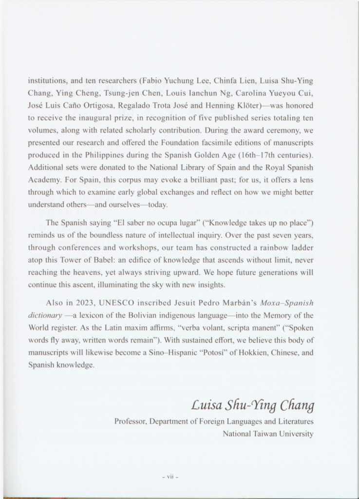 Also in 2023, UNESCO inscribed Jesuit Pedro Marbán’s Moxa–Spanish dictionary — a lexicon of the Bolivian indigenous language— into the Memory of the World register. As the Latin maxim affirms, “verba volant, scripta manent” (“Spoken words fly away, written words remain”). With sustained effort, we believe this body of manuscripts will likewise become a Sino–Hispanic “Potosí” of Hokkien, Chinese, and Spanish knowledge.