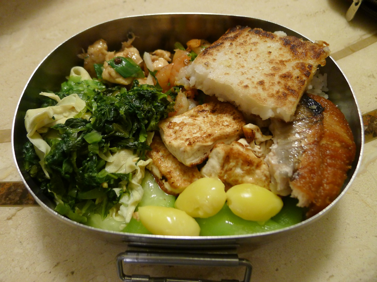 白飯+蘿蔔糕+雪菜百頁+絲瓜百果+紅燒虱目魚+宮保蝦仁+煎豆腐