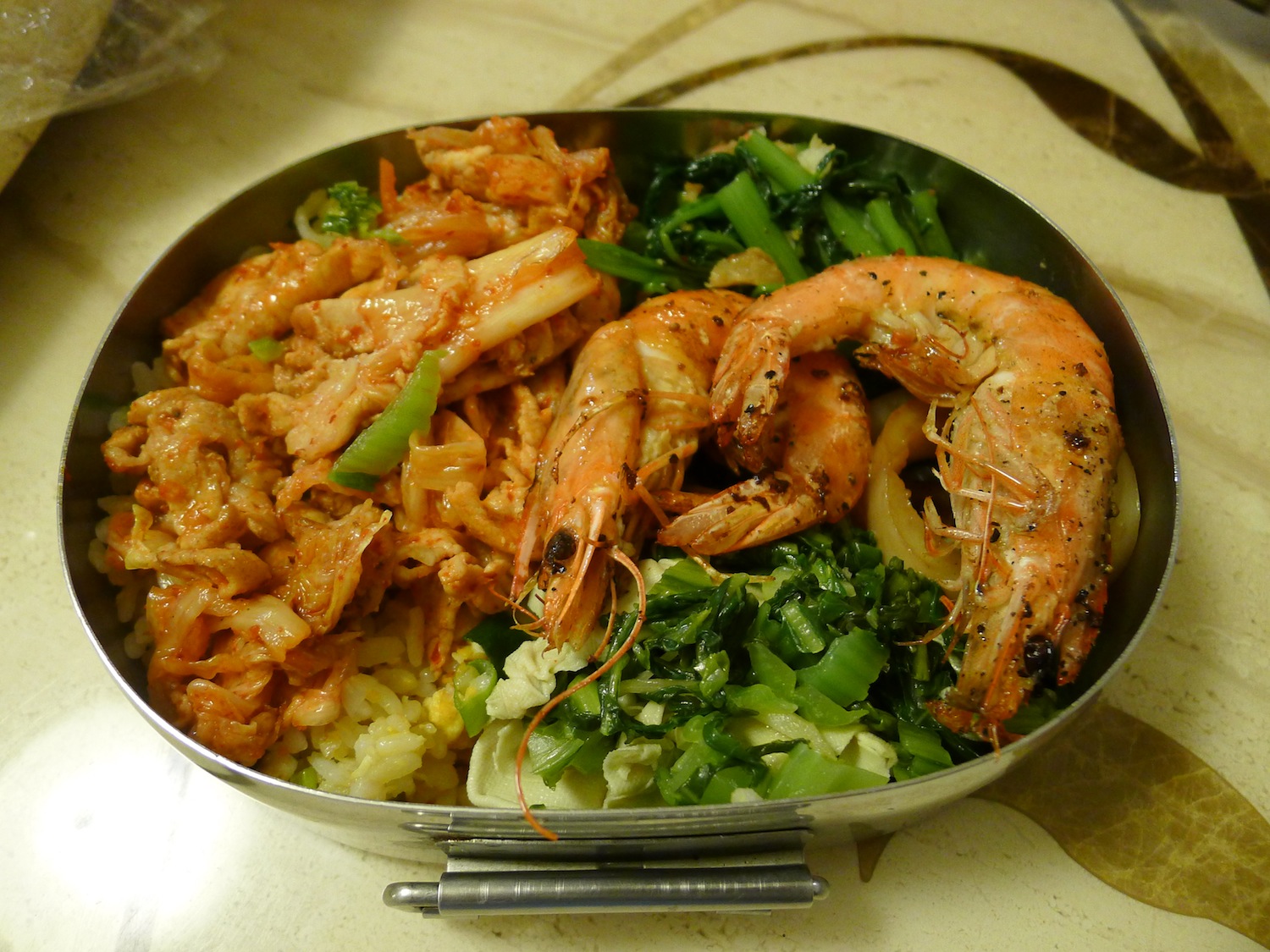 蛋炒飯+雪菜百頁+辣炒空心菜+鐵板蝦+ 泡菜豬肉片