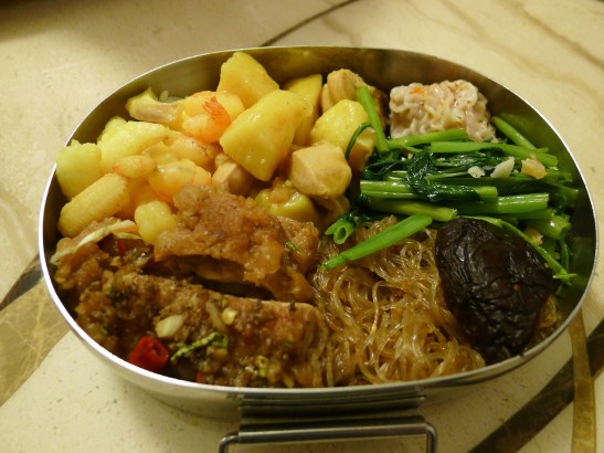 白飯+泰式椒麻雞+印度咖哩雞(含馬鈴薯)+辣炒空心菜+鮮蝦粉絲煲+紅油抄手