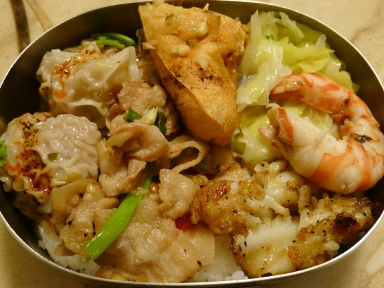 白飯+清燙明蝦+紅油抄手+辣炒五花豬肉片+鹽穌透抽+炸豆腐+高麗菜