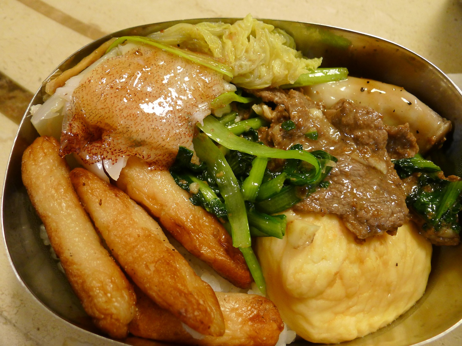白飯+天婦羅+蒸紅鰷+日式青江菜炒牛肉+蒙古包+杏鮑菇+滷白菜
