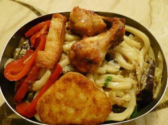 炒烏龍麵+薯餅+烤雞腿+甜不辣+紅椒