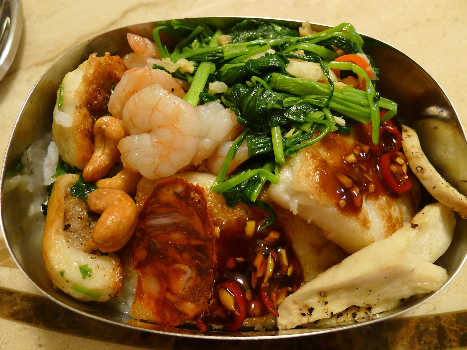 白飯+腰果蝦仁++蘿蔔糕+杏鮑菇+西班牙香腸+煎福州魚丸+炒空心菜