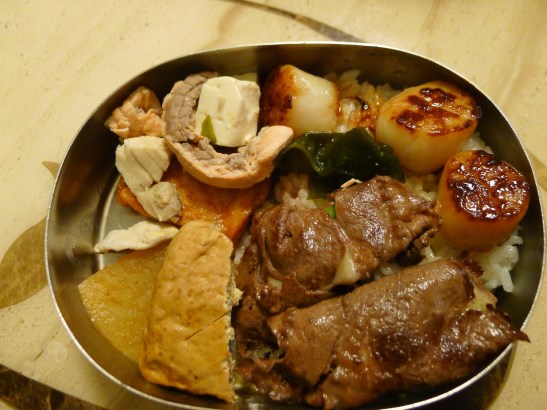白飯+起司牛肉捲+乾煎新鮮干貝+嫩豆腐+滷豆腐+滷白蘿蔔+海苔+湯煮鮭魚