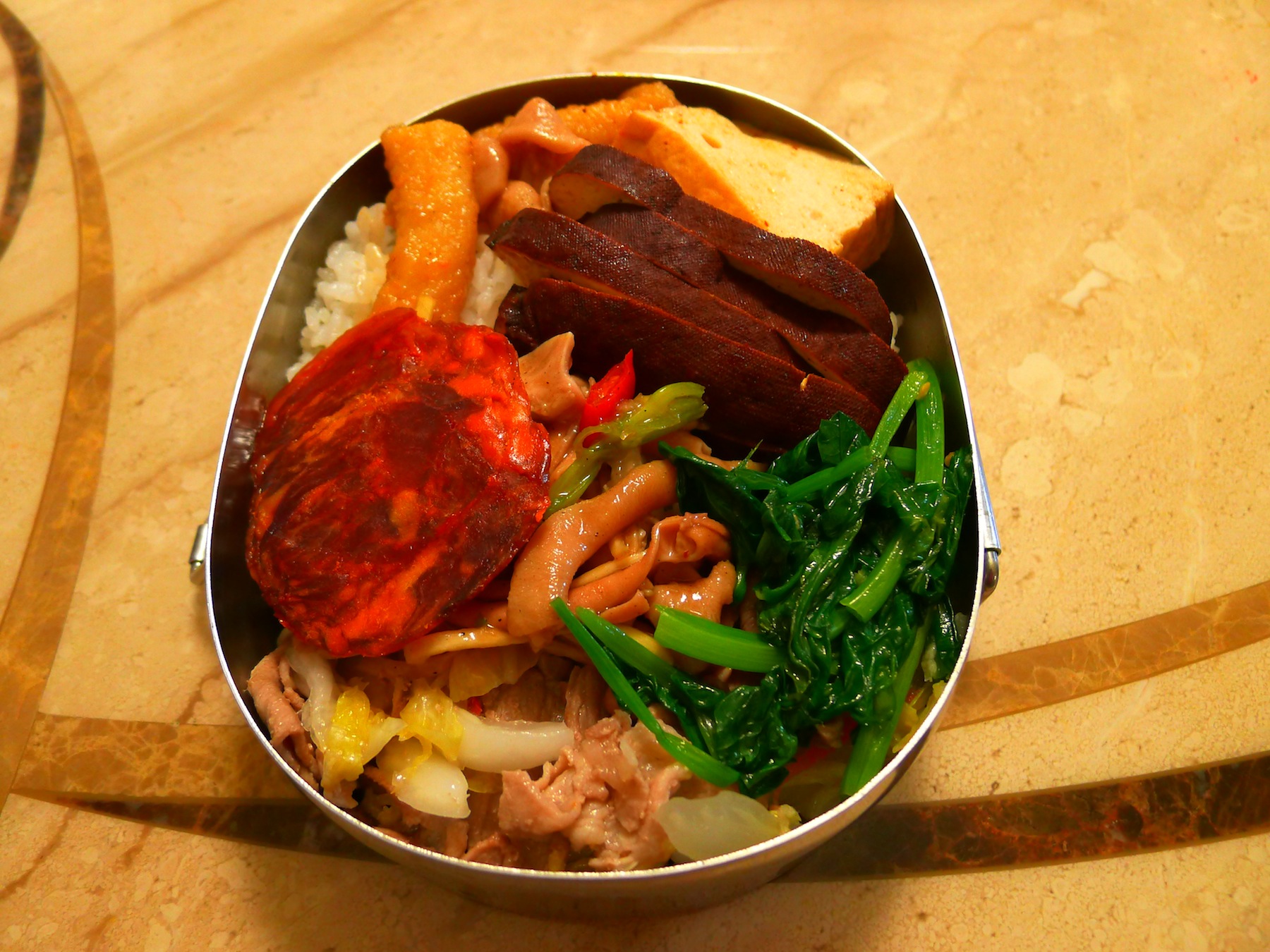 白飯+大豆苗+滷大豆干+甜不辣+炒鵝腸 +酸白菜炒肉絲+西班牙香腸