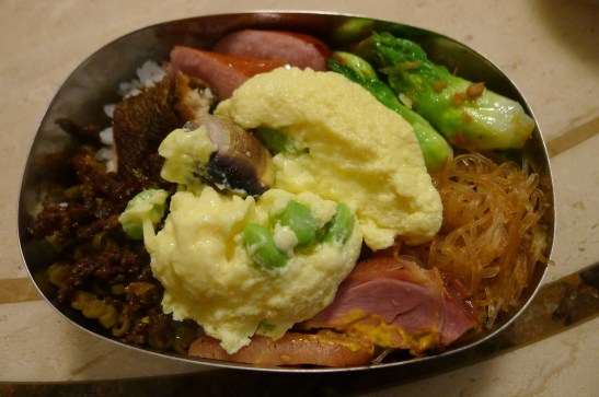 白飯+蛤蠣毛豆蒸蛋+酸豆角肉末+煎香腸+娃娃菜+德國豬腳+冬粉