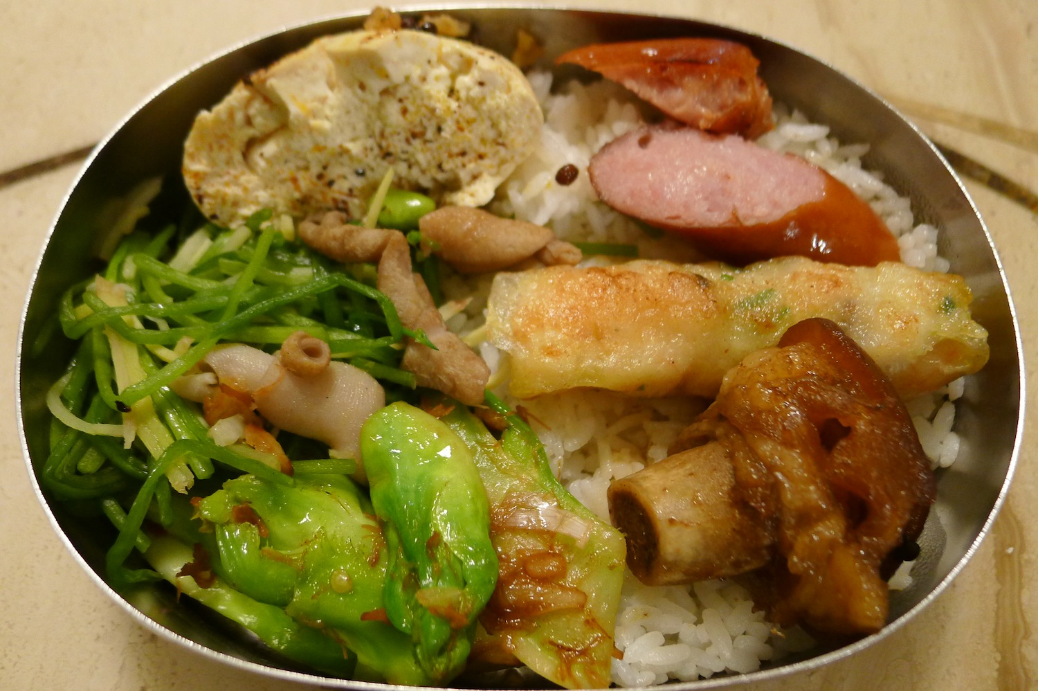 白飯+澎湖蝦卷+香腸+豬腳+臭豆腐+水蓮菜炒鵝腸+娃娃菜