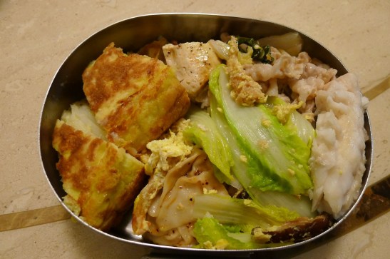 白飯+馬鈴薯蛋餅+蒸紅鰷魚+高山娃娃菜+酸白菜炒五花肉+紅油抄手