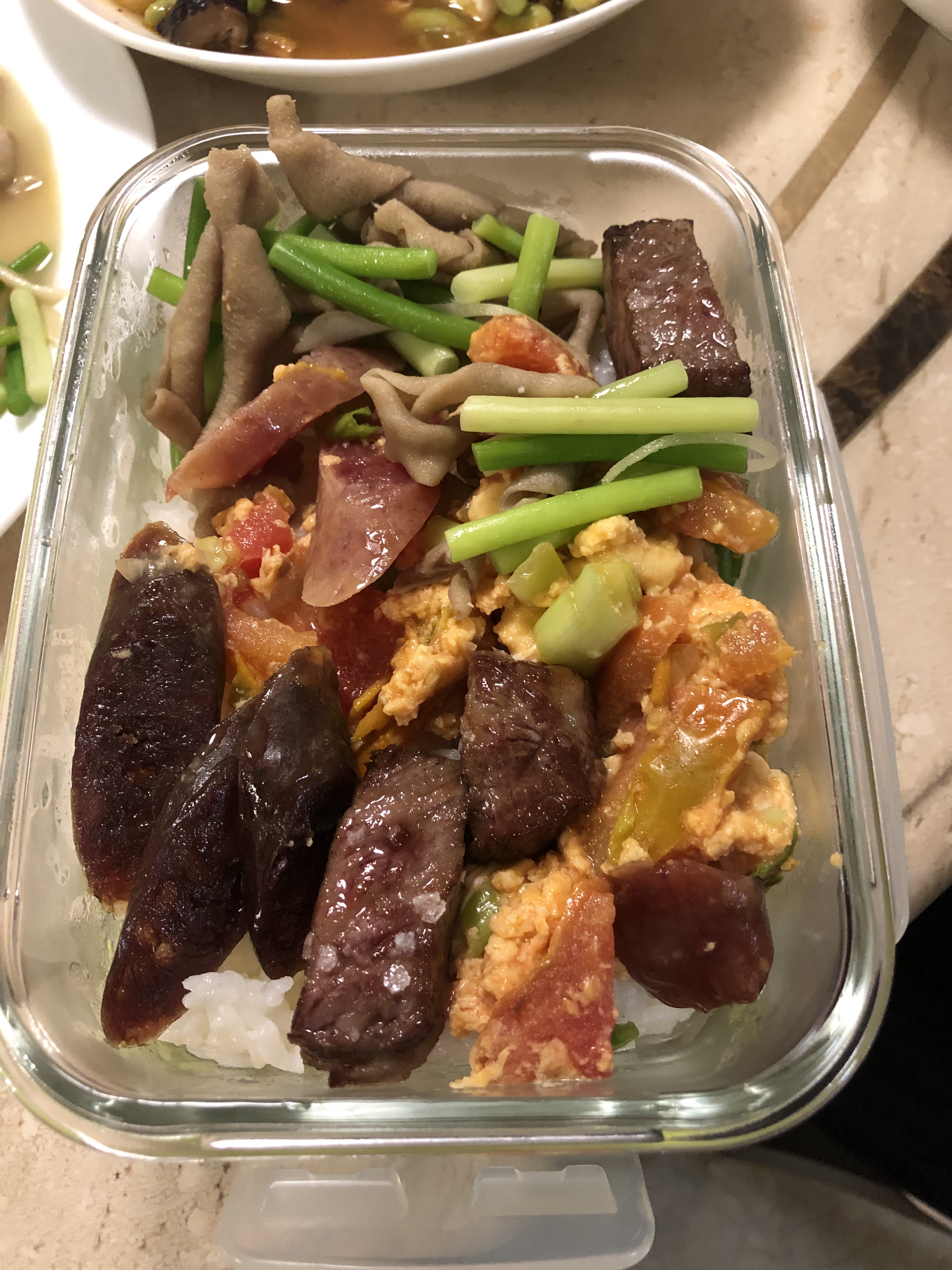 白飯+蒜薹炒鴨腸; 肝腸; 番茄蝦仁炒蛋; 無骨牛小排