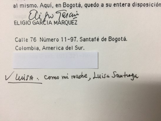 馬奎斯的弟弟 Eligio García Márquez 來信。末尾寫上:「LUISA: 跟我的母親的名字一樣,Luisa Santiaga」