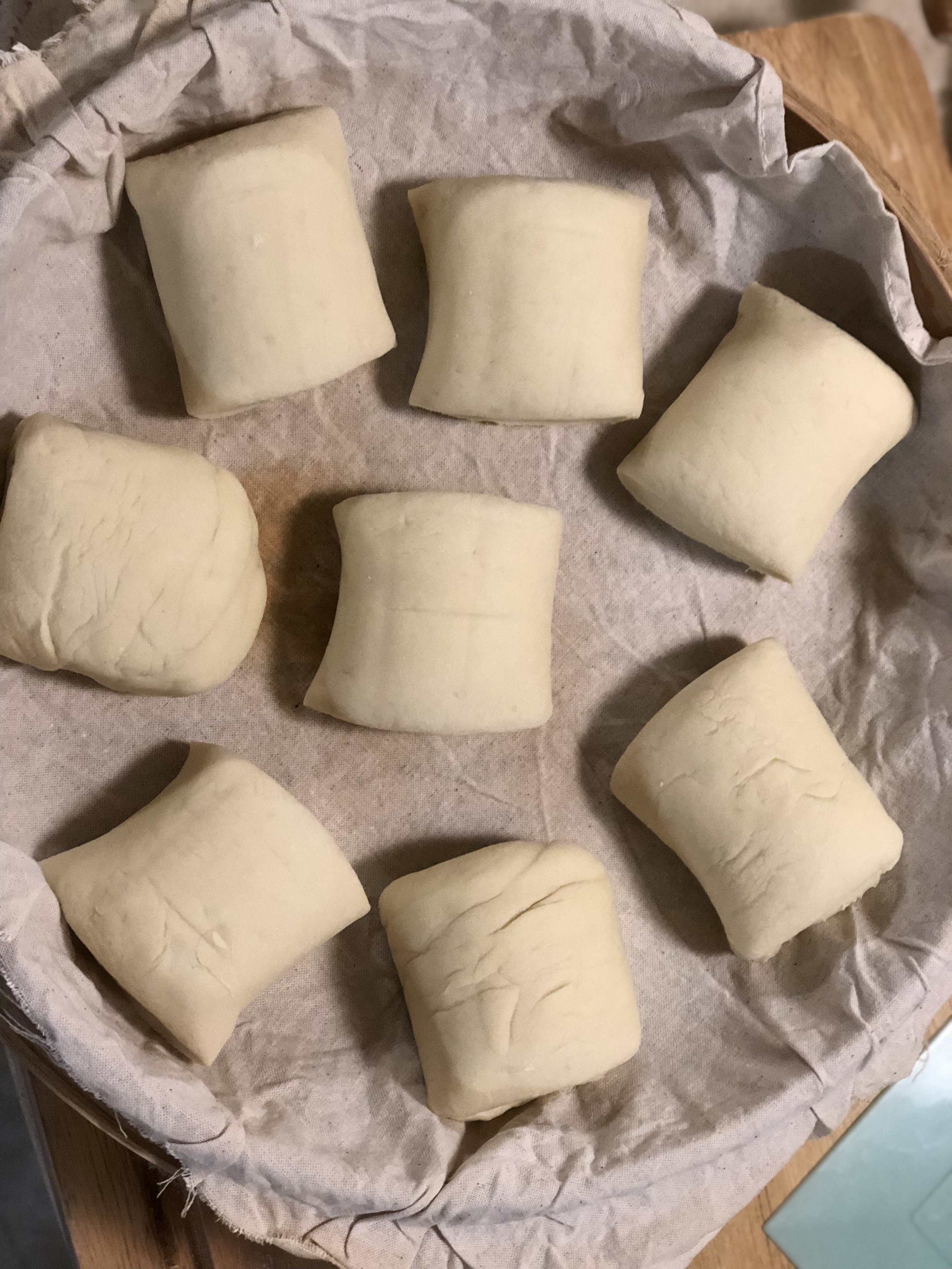 長條切成幾個饅頭狀再發酵些時,兩端不易平整,有皺紋