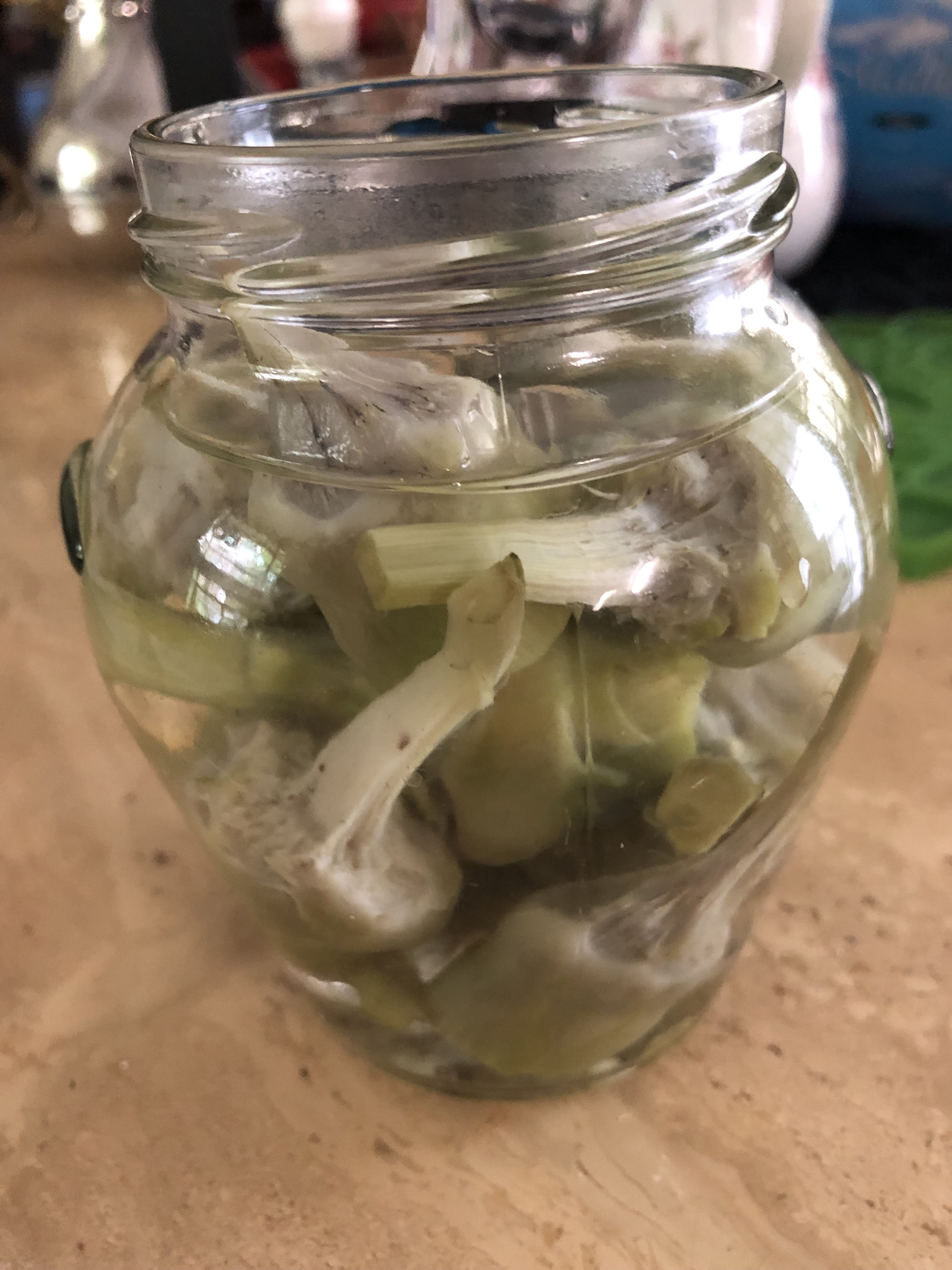煮好瀝乾晾涼的 Baby 朝鮮薊,帶莖一起入味