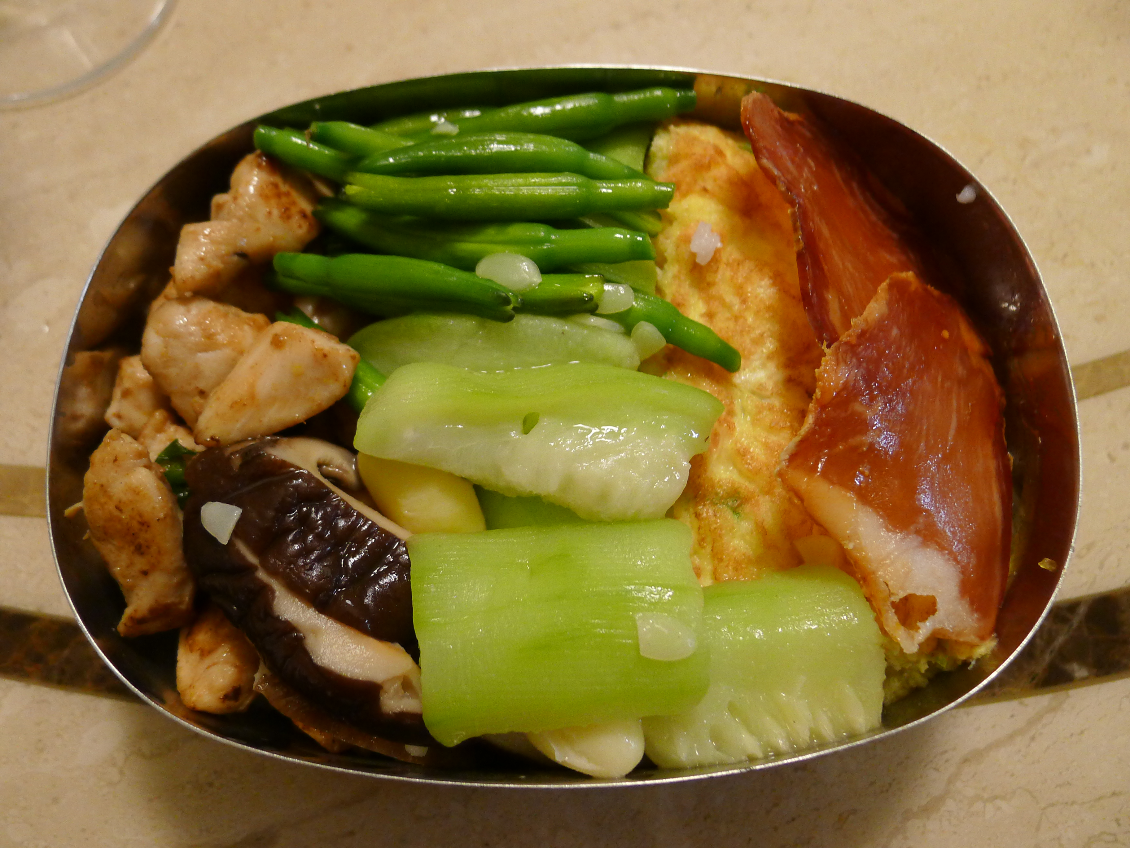 白飯+西班牙里肌香腸+絲瓜+雞丁+百果、金針花+西班牙鱈魚蛋餅